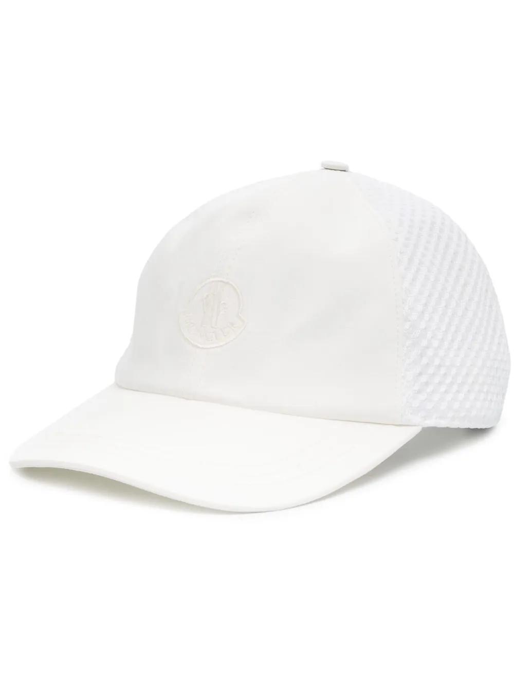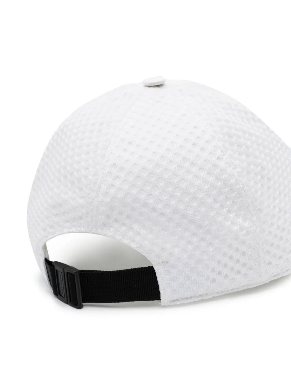 white cotton blend embroidered logo to the front mesh detailing fabric-covered button at the crown curved peak adjustable neck strap