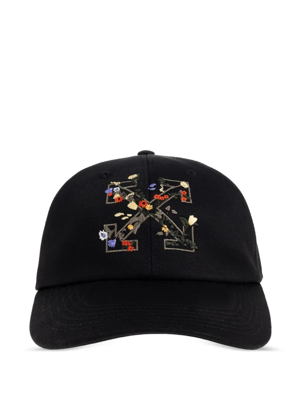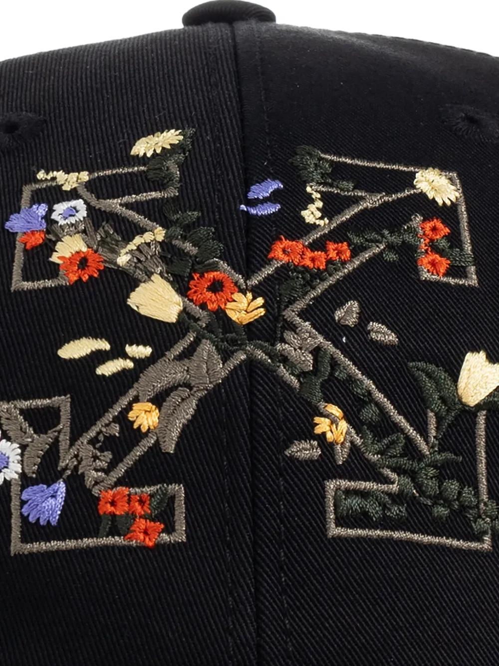 black cotton material embroidered floral X motif adjustable buckle fastening curved brim baseball cap style
