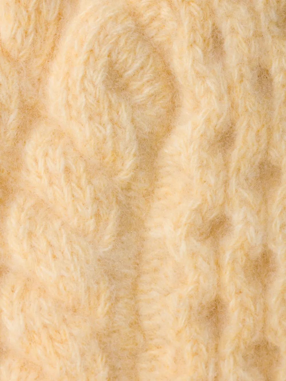 pale yellow cable knit triangle logo metal embellishment ribbed brim wool fabric
