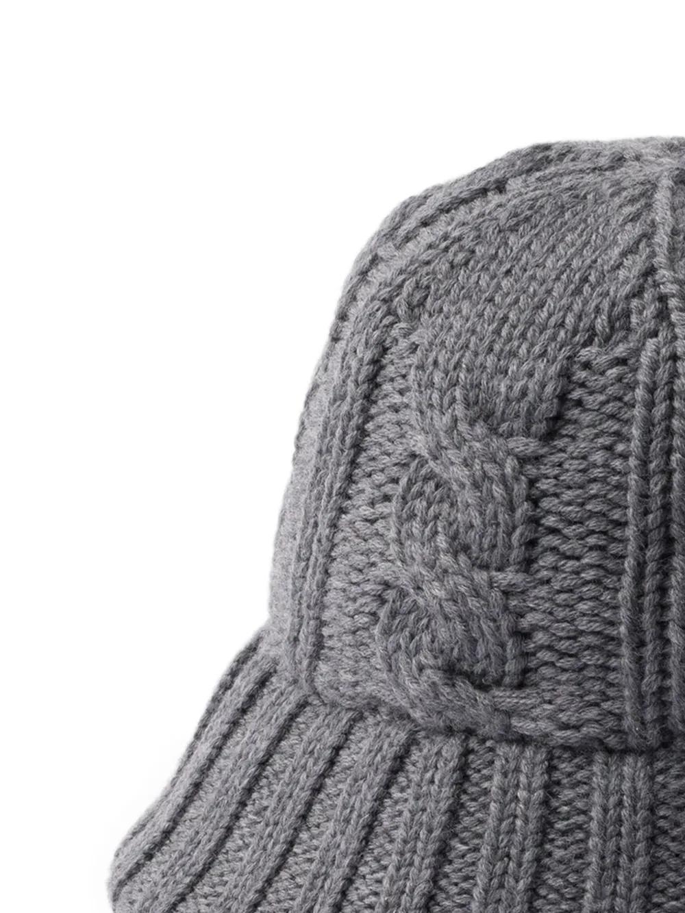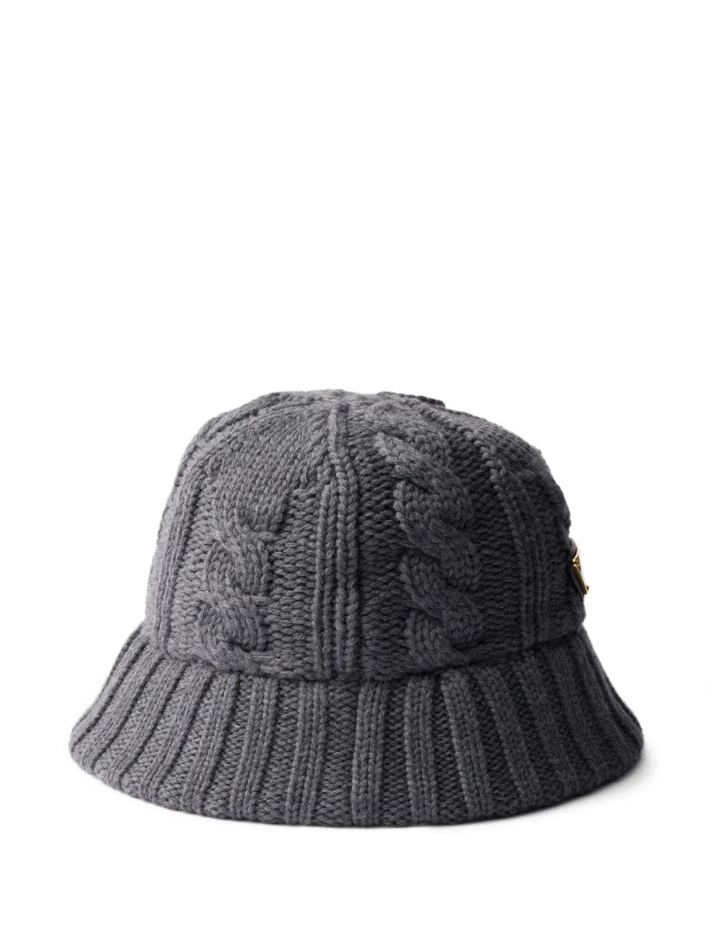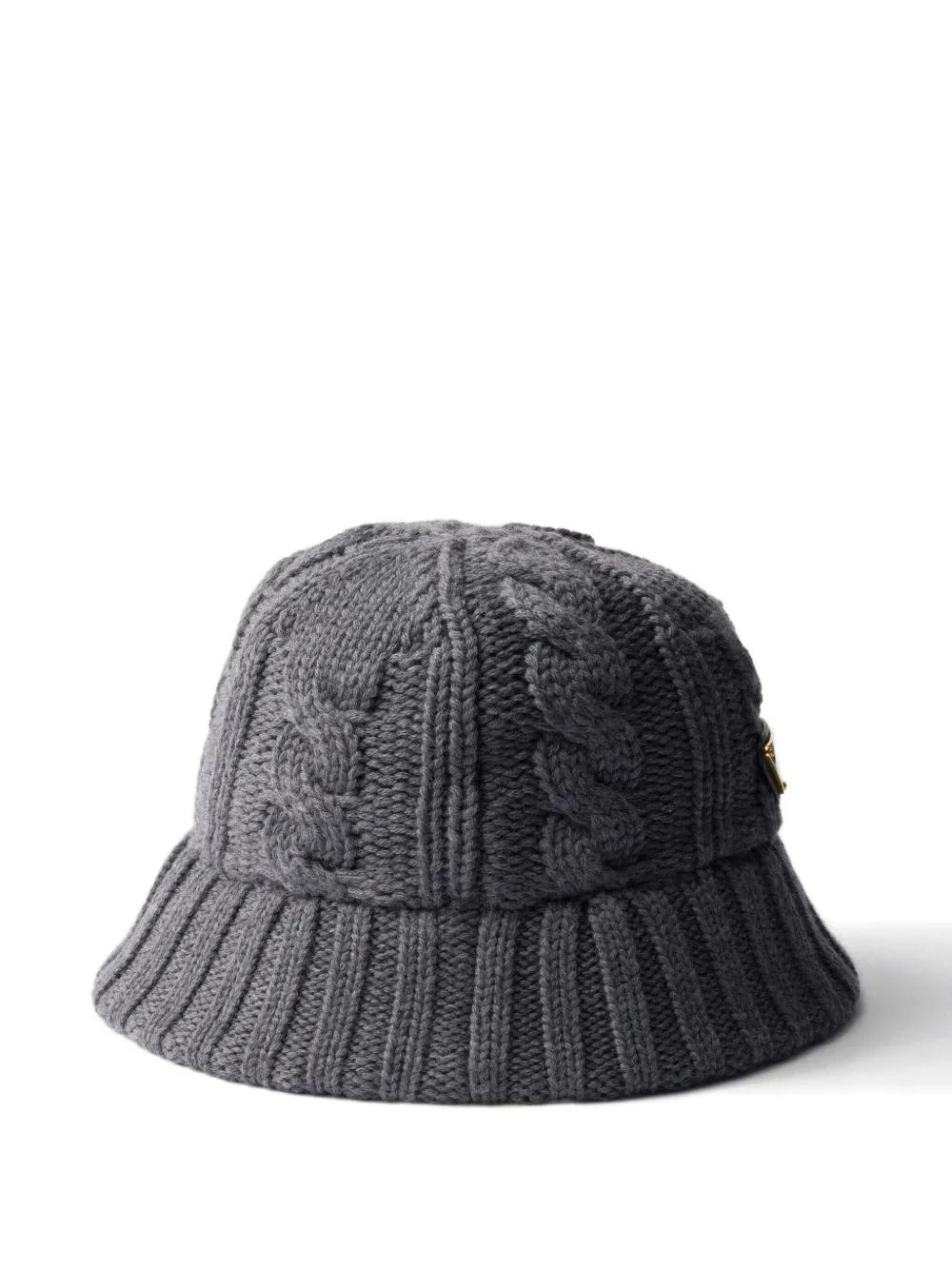 grey cable knit bucket shape enamel metal triangle logo ribbed brim