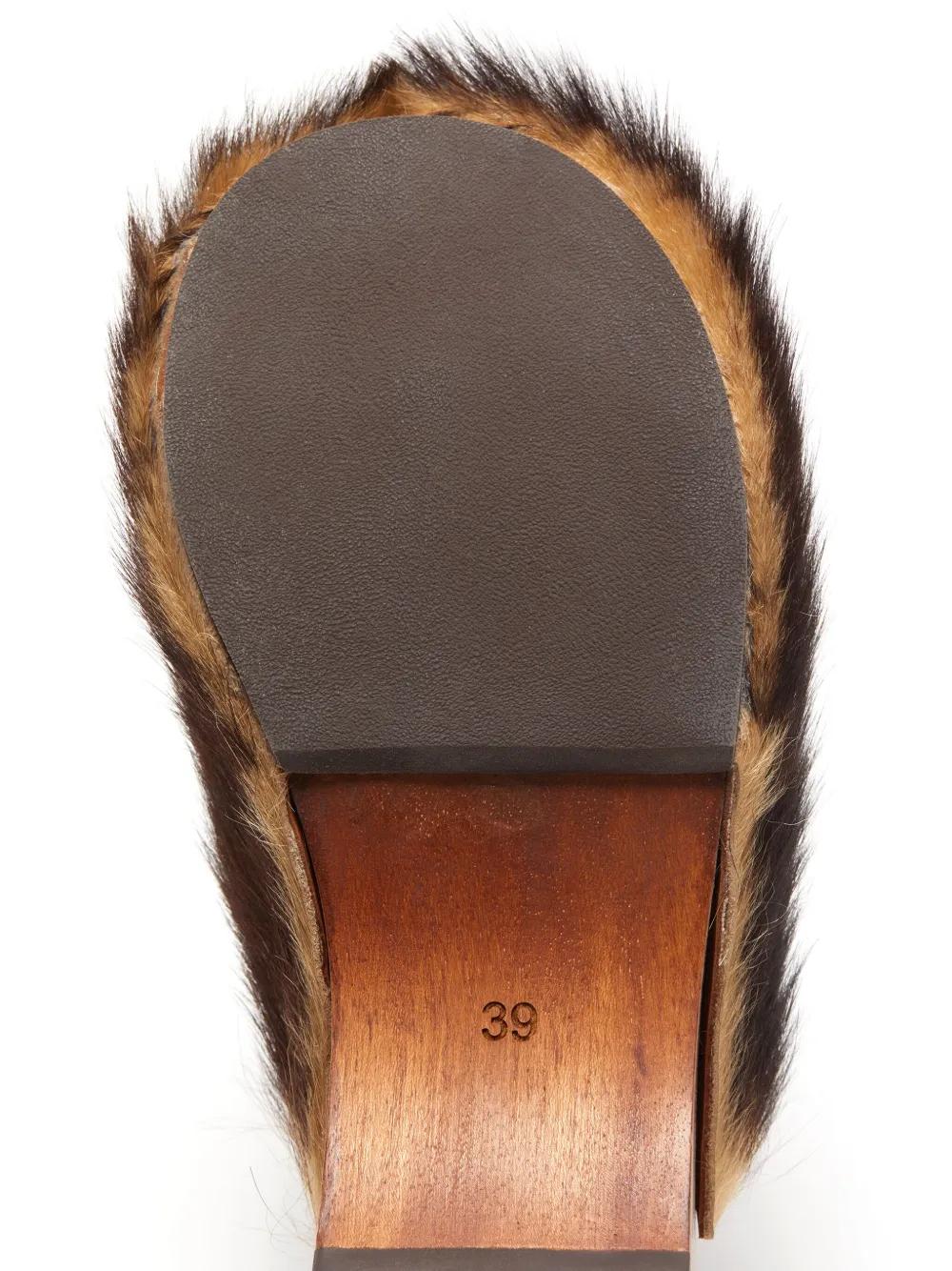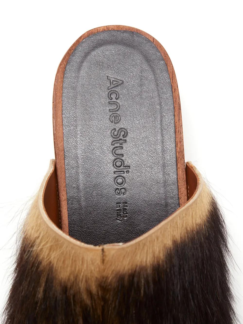 brown wood/calf hair slip-on style logo print to the rear round toe branded footbed wooden platform sole