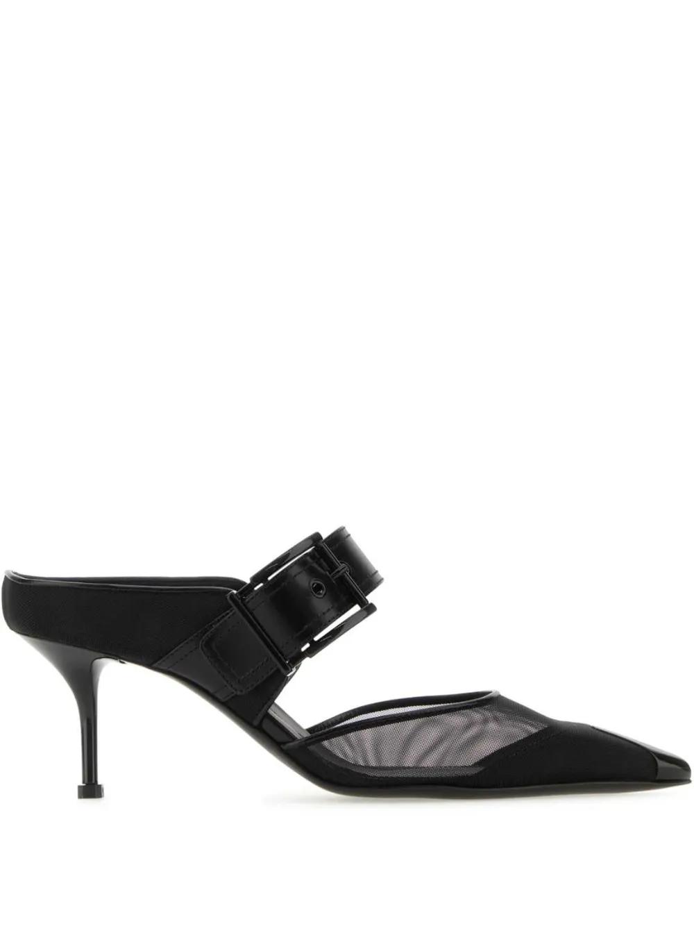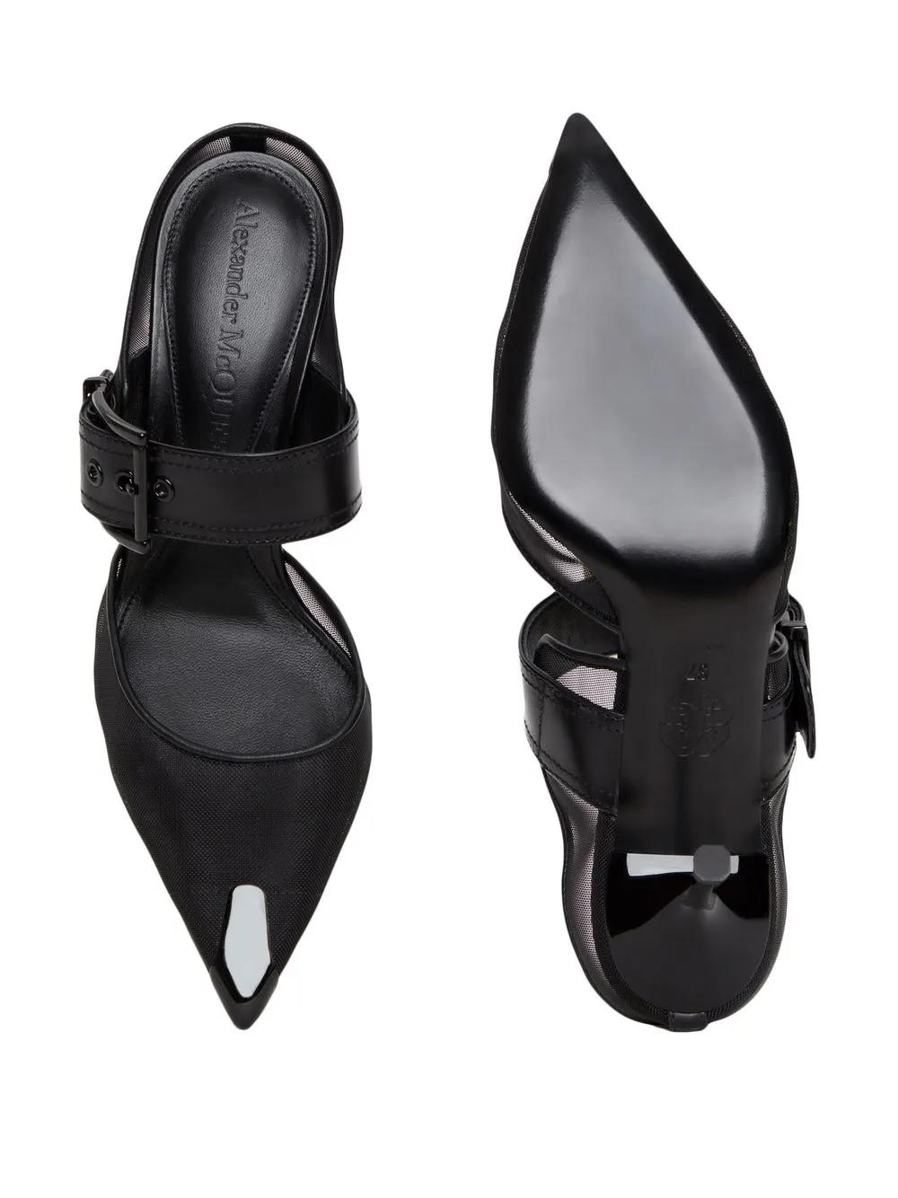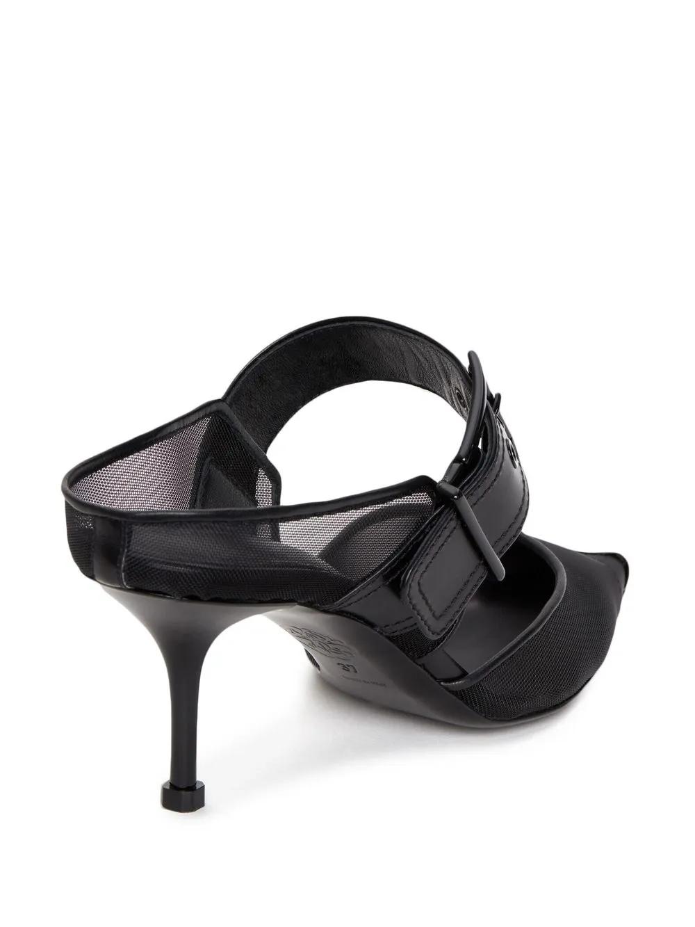 black mesh panelling pointed toe open back buckle fastening branded footbed mid heel