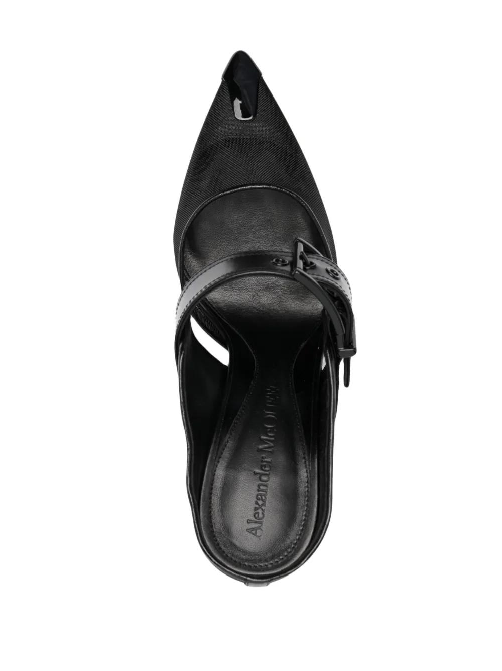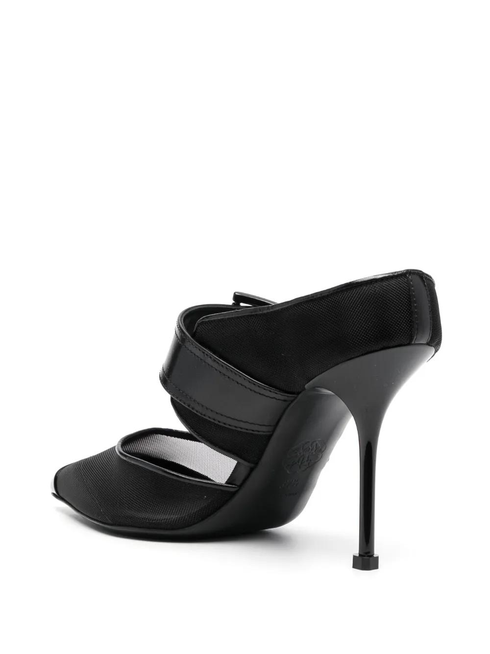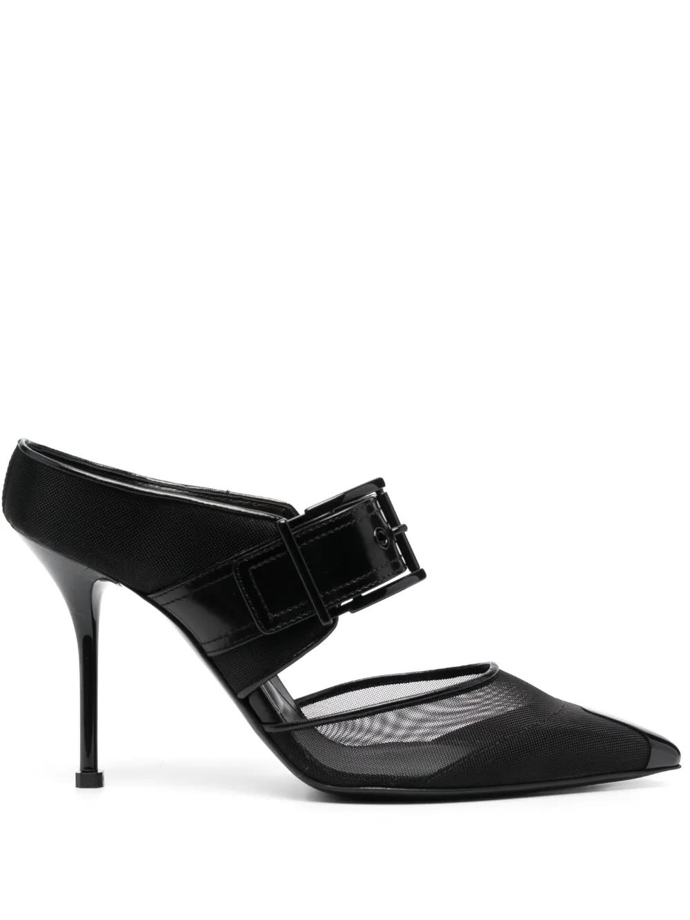 black calf leather mesh panelling pointed toe open back buckle fastening branded footbed high stiletto heel