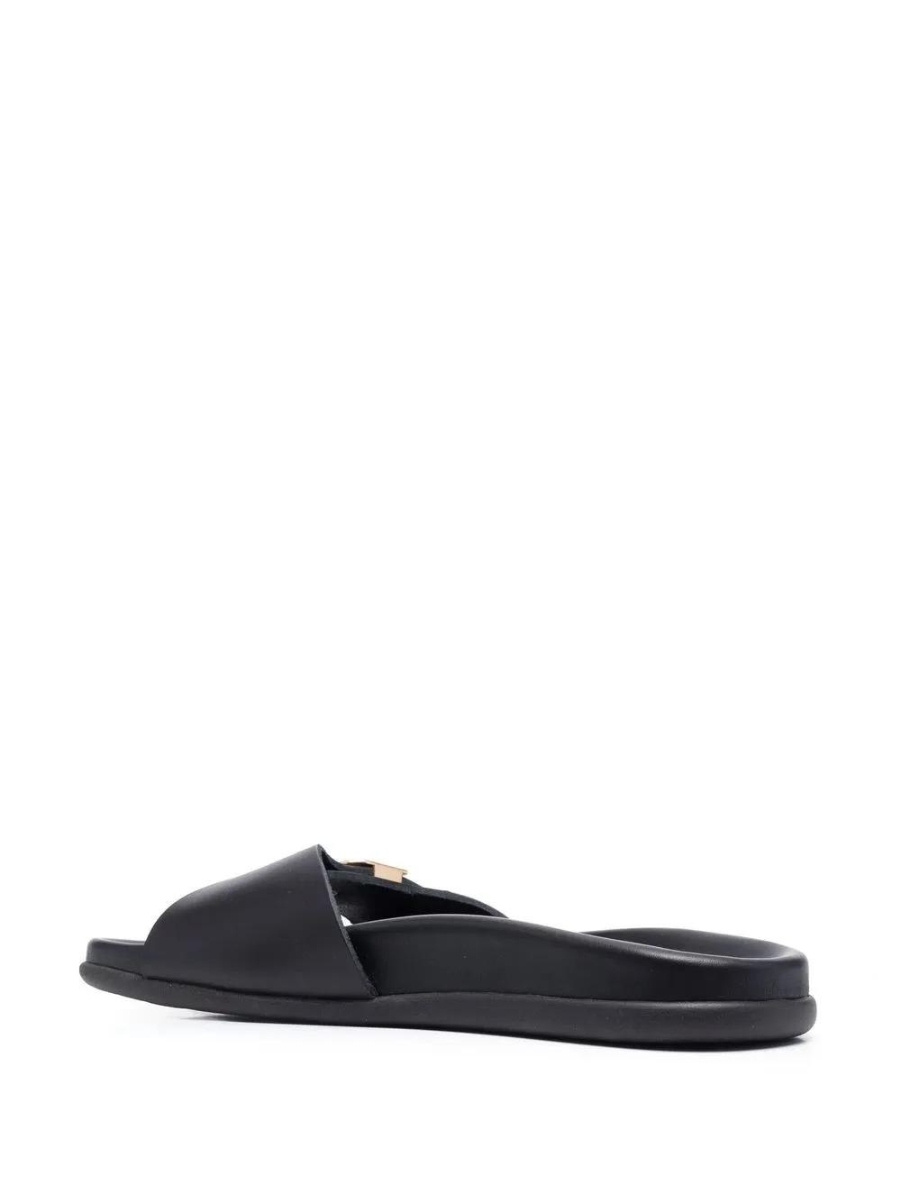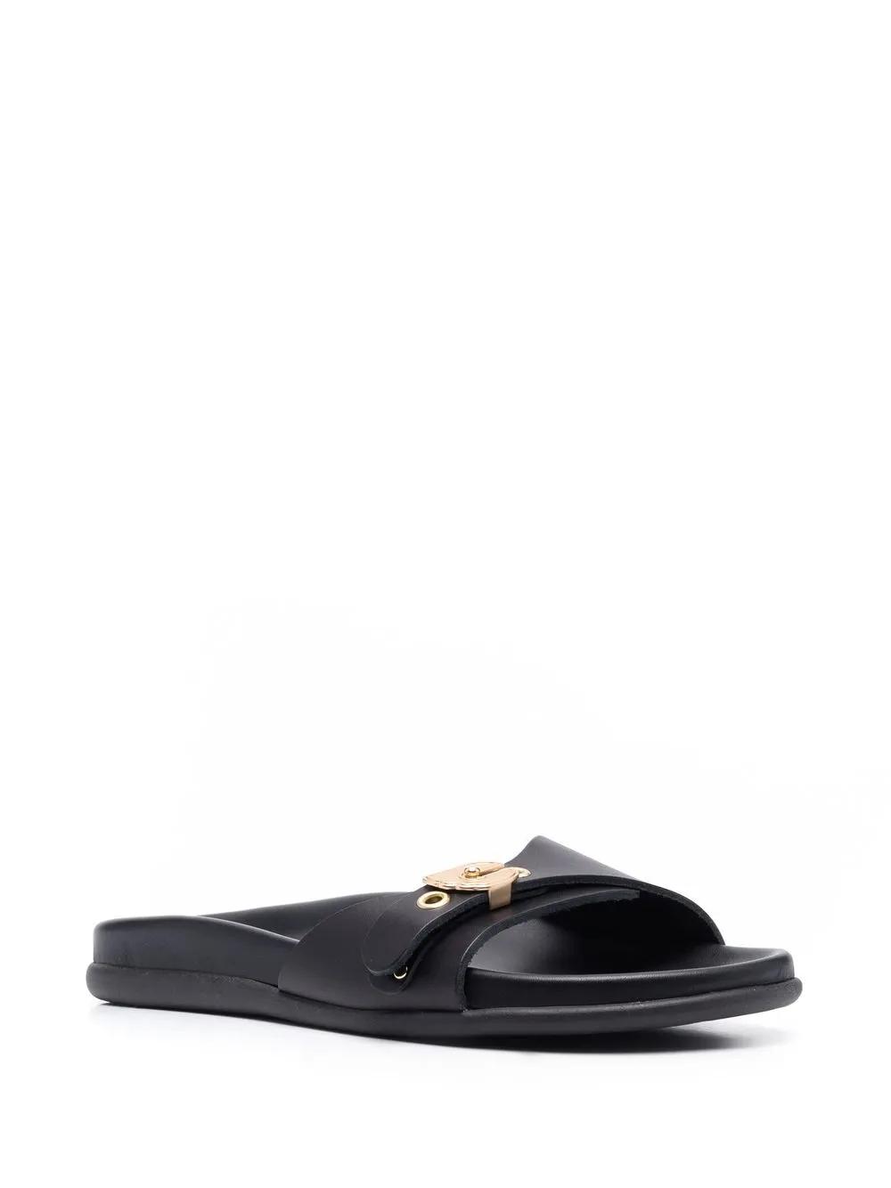 black calf leather open toe crossover strap at the toe gold-tone clasp fastening slip-on style flat sole