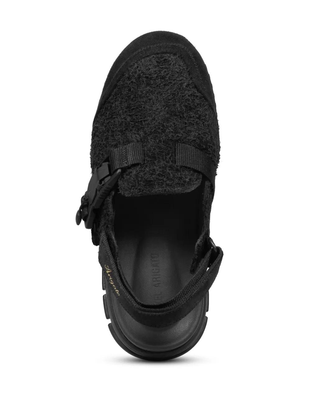 black suede decorative buckle detail logo stamp at side branded insole adjustable strap to the rear rubber sole