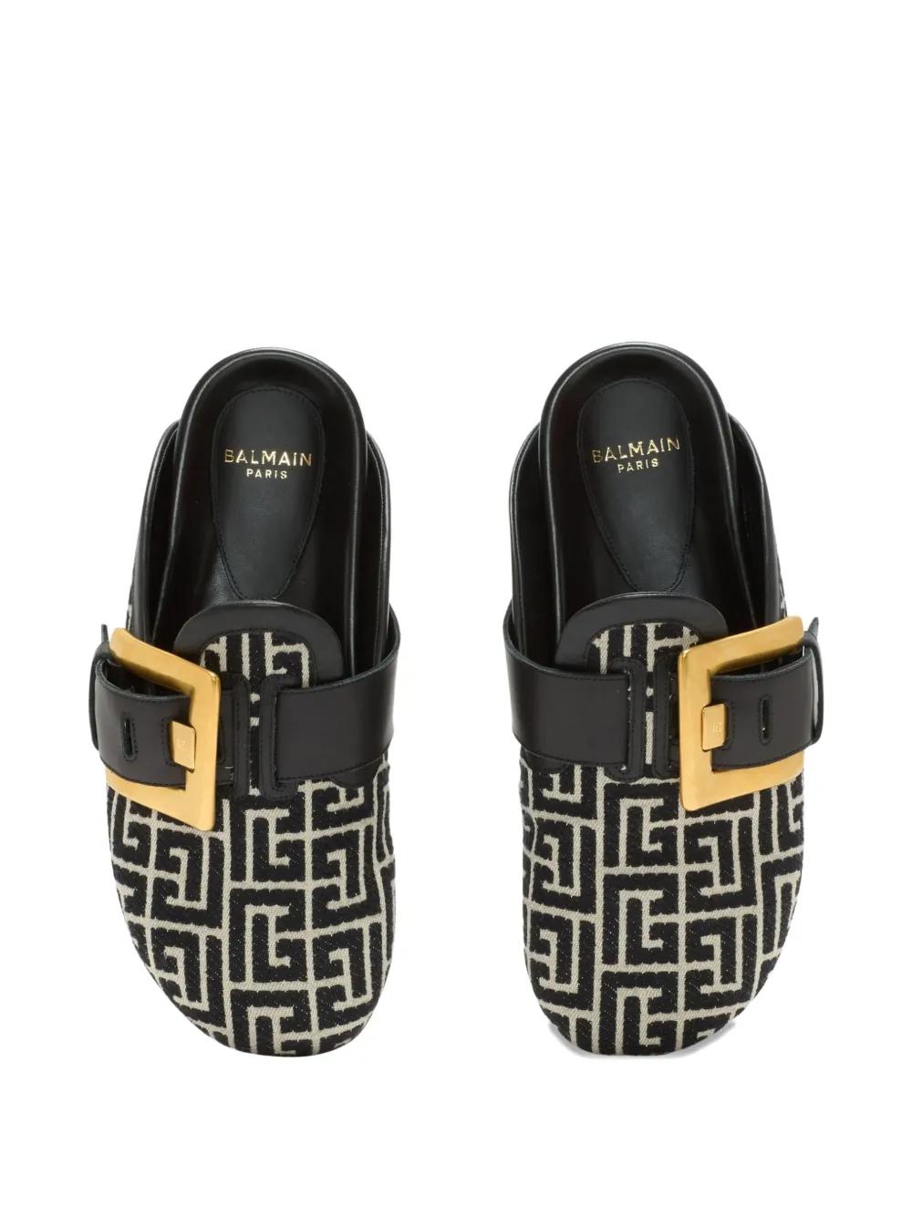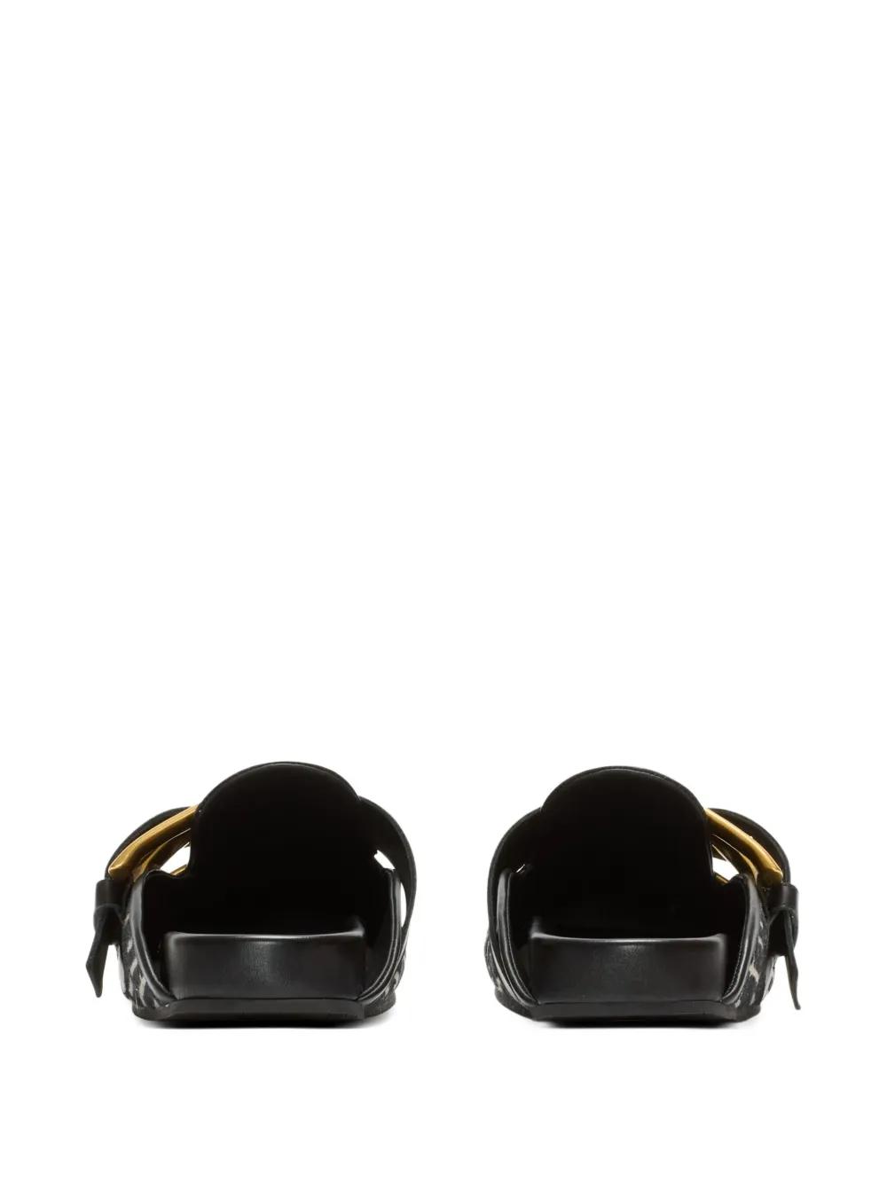 black slip-on style flat rubber sole decorative buckle detail branded footbed