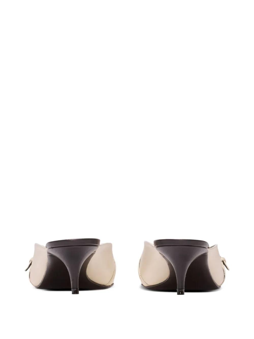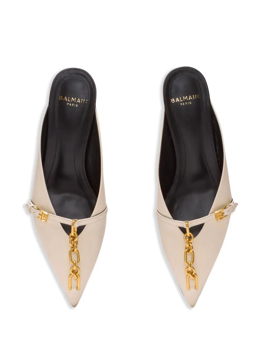 beige buckle-strap fastening pointed toe kitten heel chain-link detailing