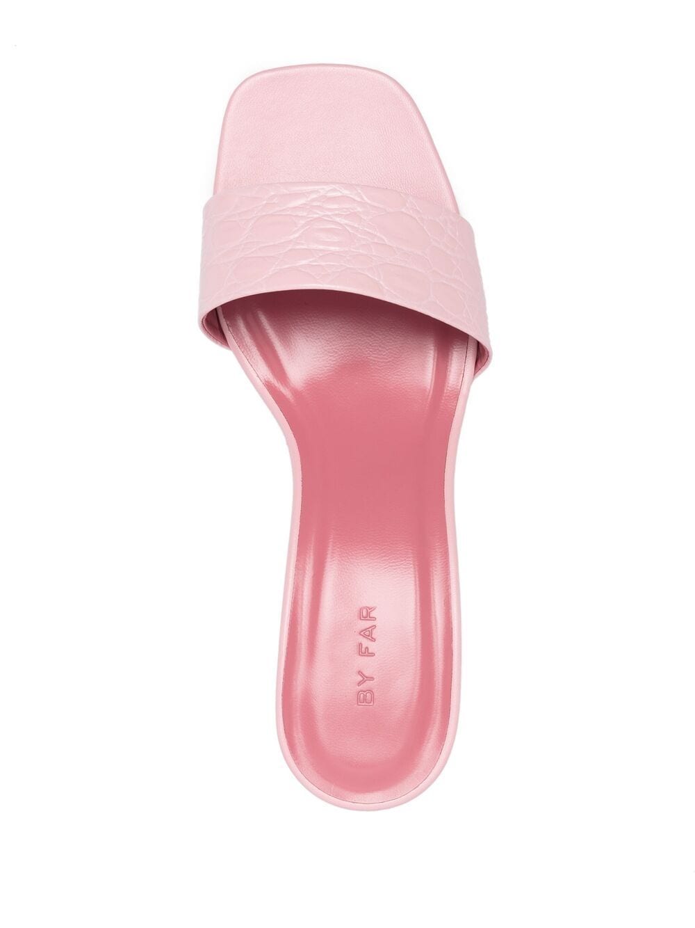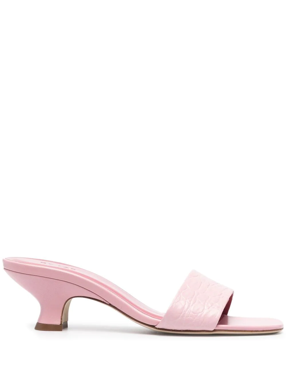 Rose pink leather Ceni slip-on leather mules from BY FAR featuring embossed crocodile effect, open toe, branded insole and kitten heel.
