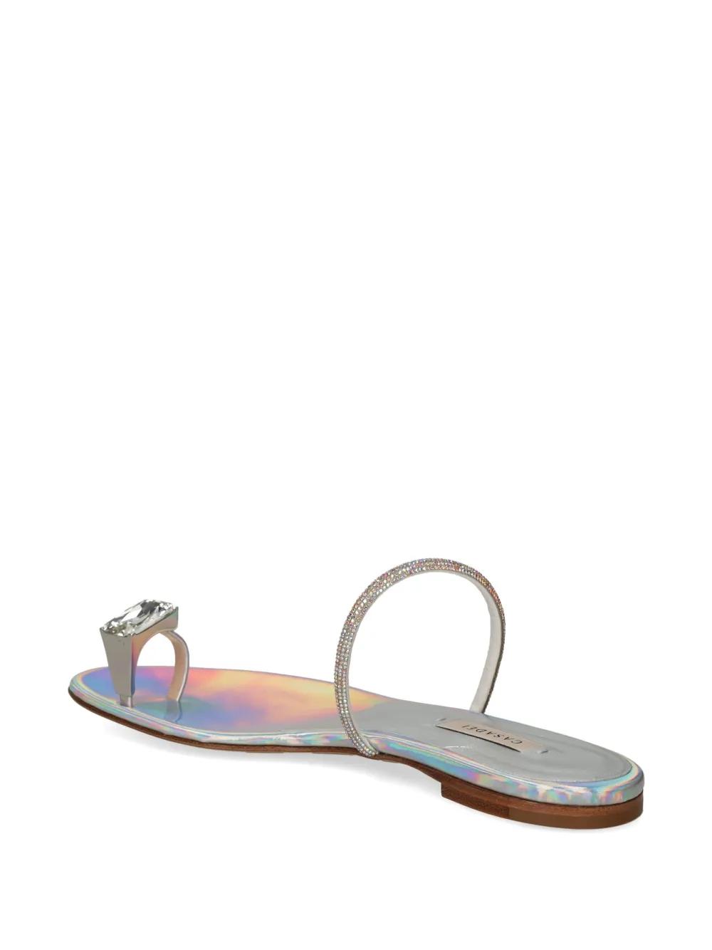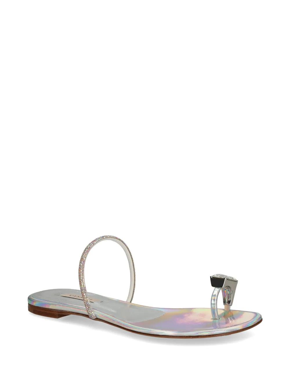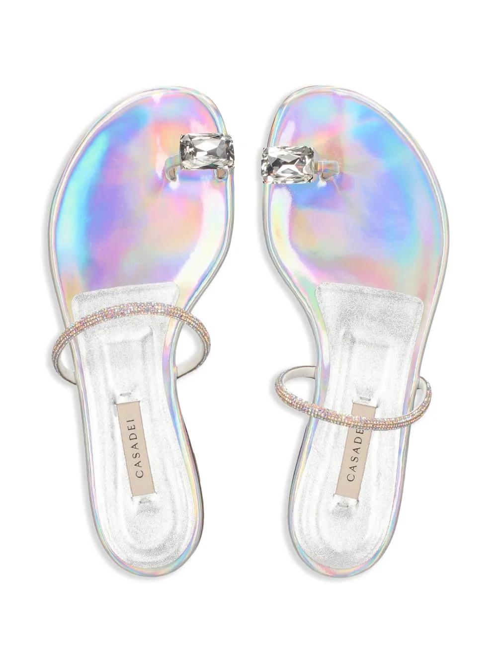 silver-tone slip-on style single toe strap crystal embellishment iridescent effect