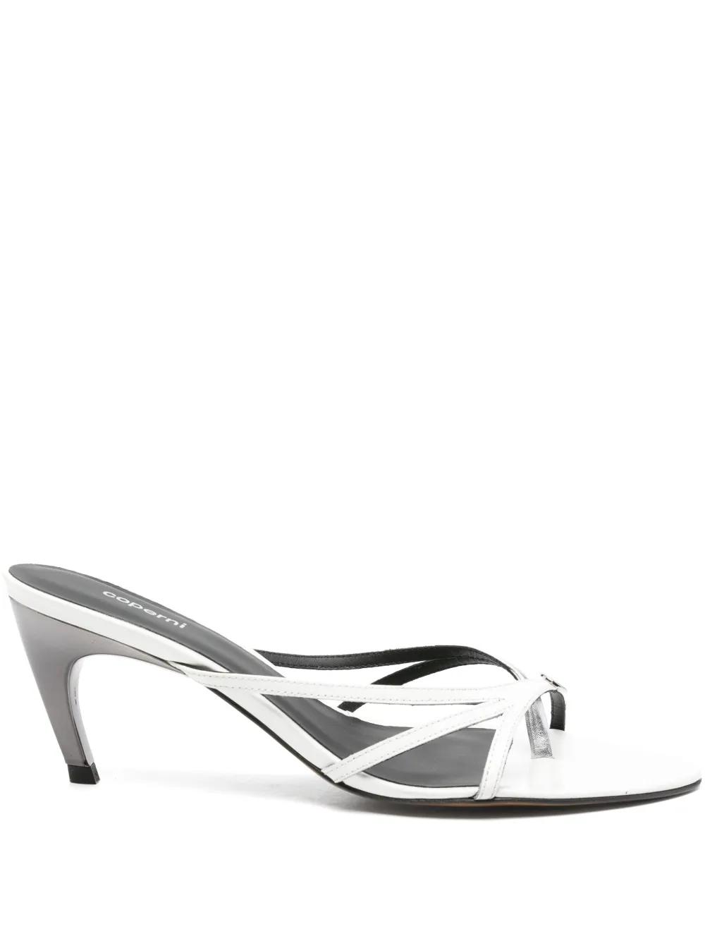 black mesh panelling pointed toe open back buckle fastening branded footbed mid heel