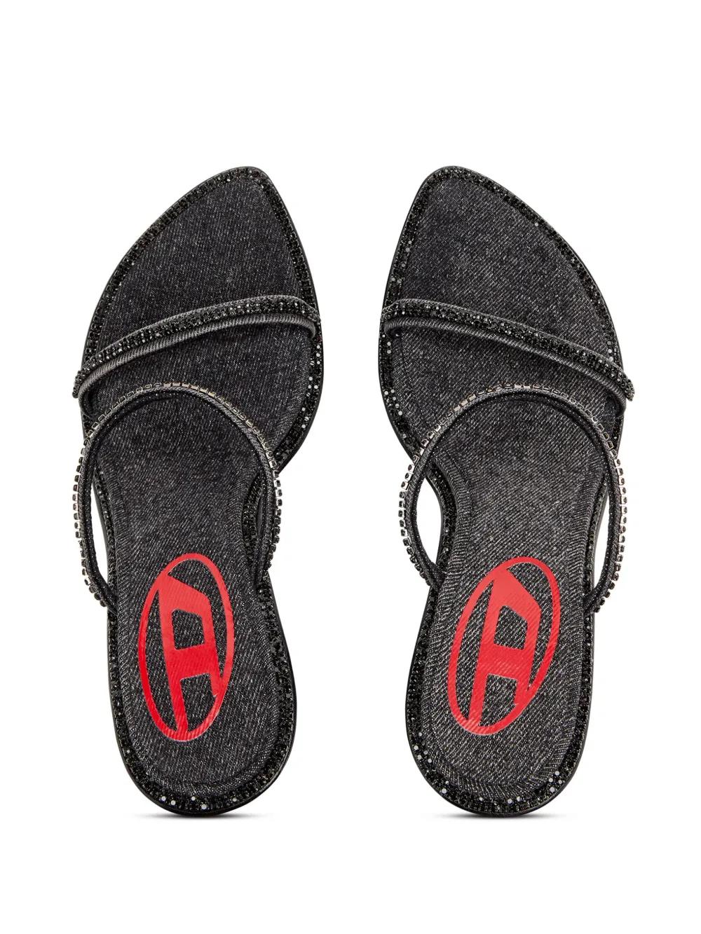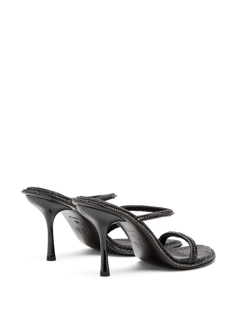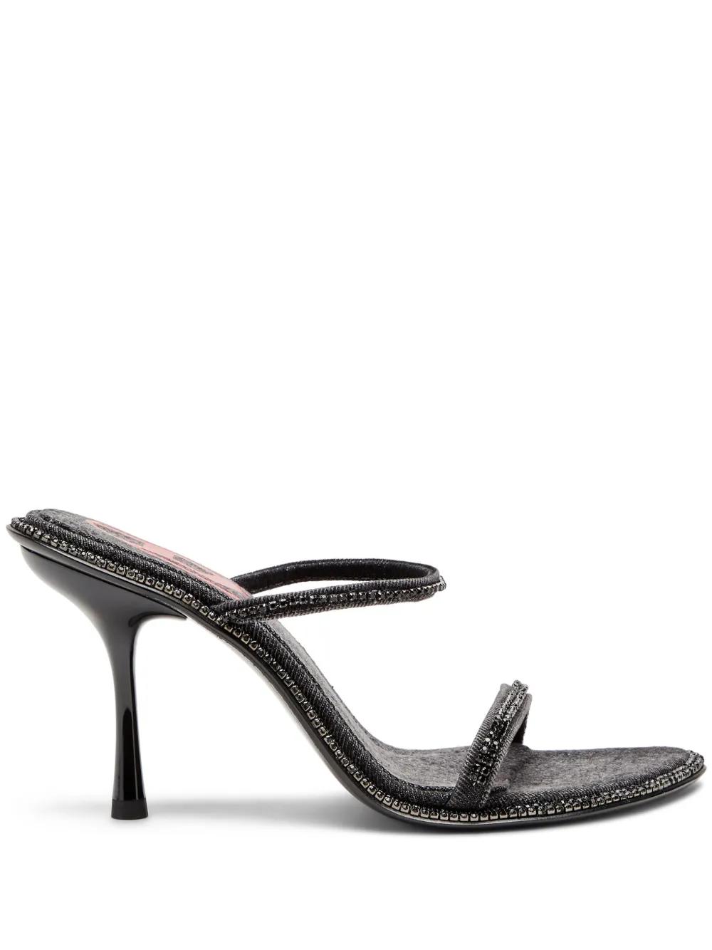 black cotton denim slip-on style stiletto heel crystal embellishment open toe branded insole leather sole