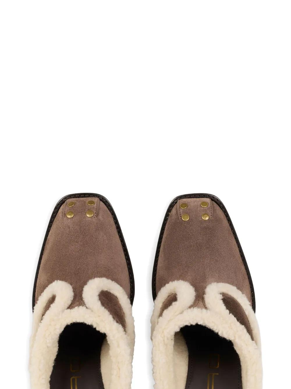 brown suede upper shearling trim gold-tone studs curved heel square toe