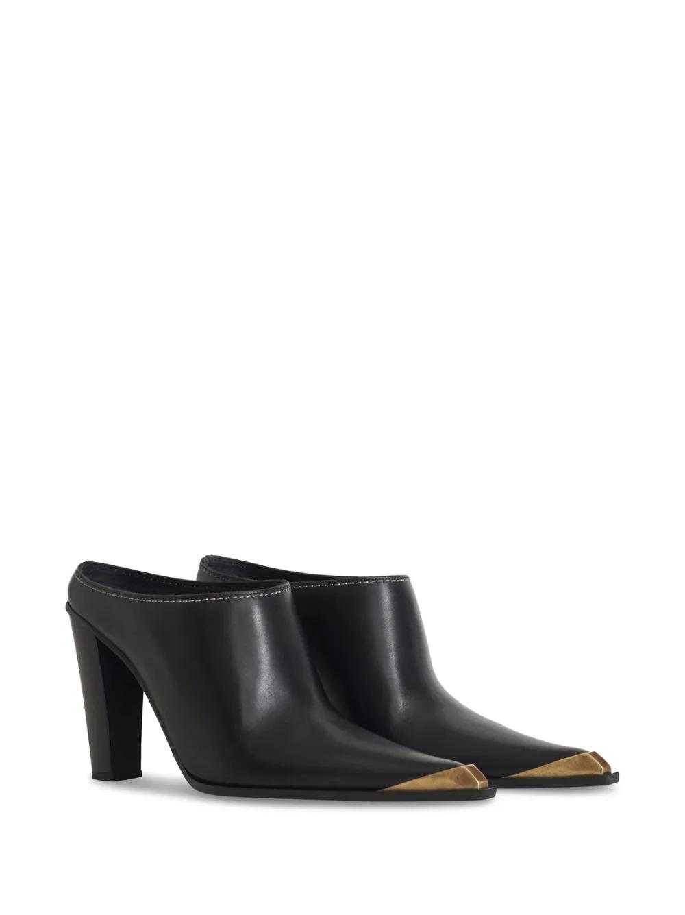 black leather/calf leather smooth grain metal toecap pointed toe slip-on style branded leather insole high heel leather sole