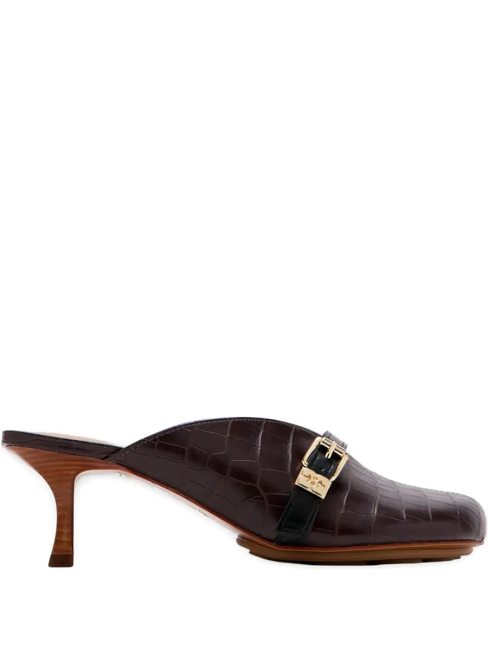 brown embossed crocodile effect decorative buckle detail slip-on style round toe