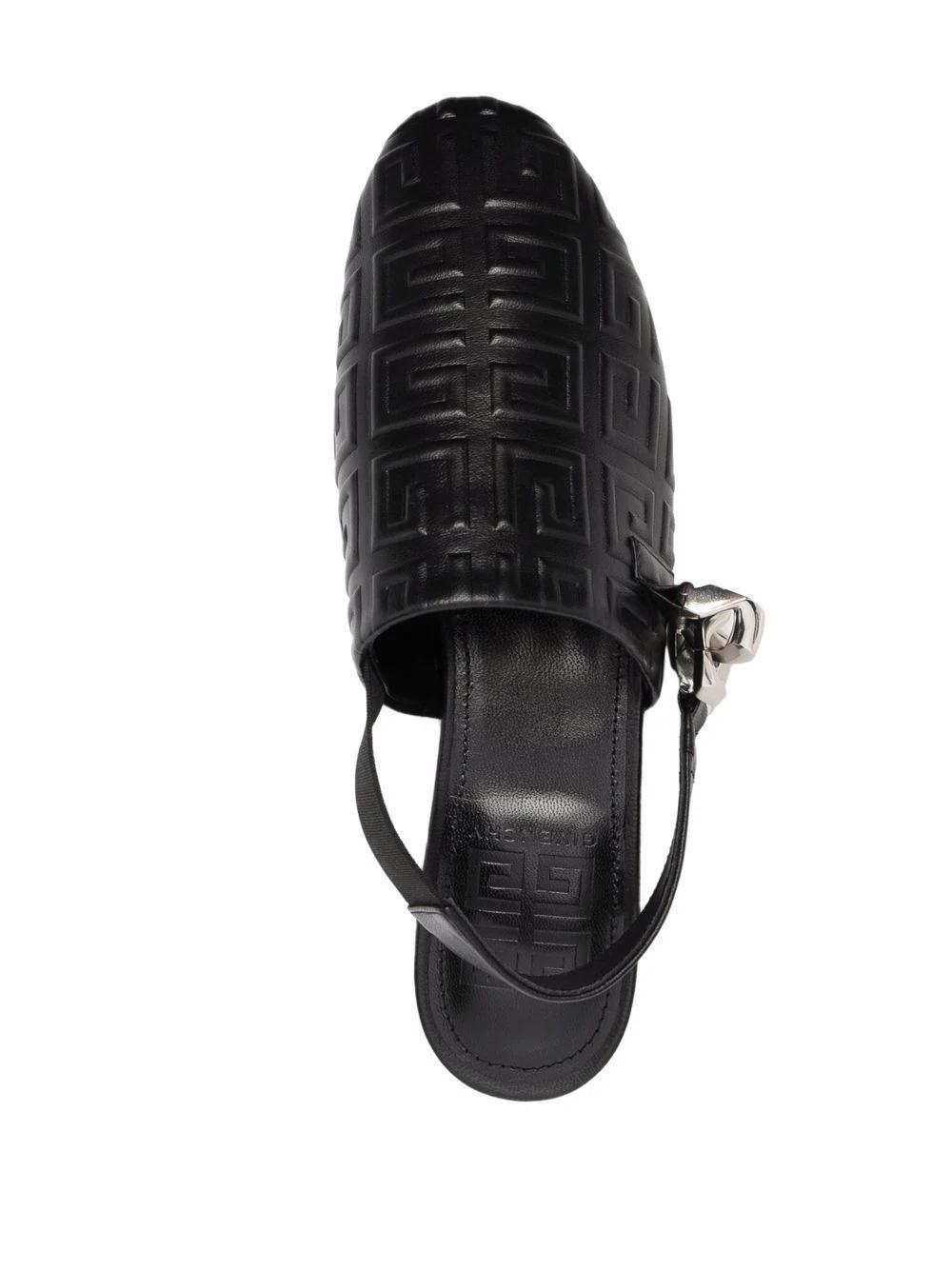 Black lambskin 4G-motif flat mules from GIVENCHY featuring signature 4G motif, embossed monogram pattern, silver-tone hardware, slip-on style, slingback strap, branded leather insole and flat leather sole.