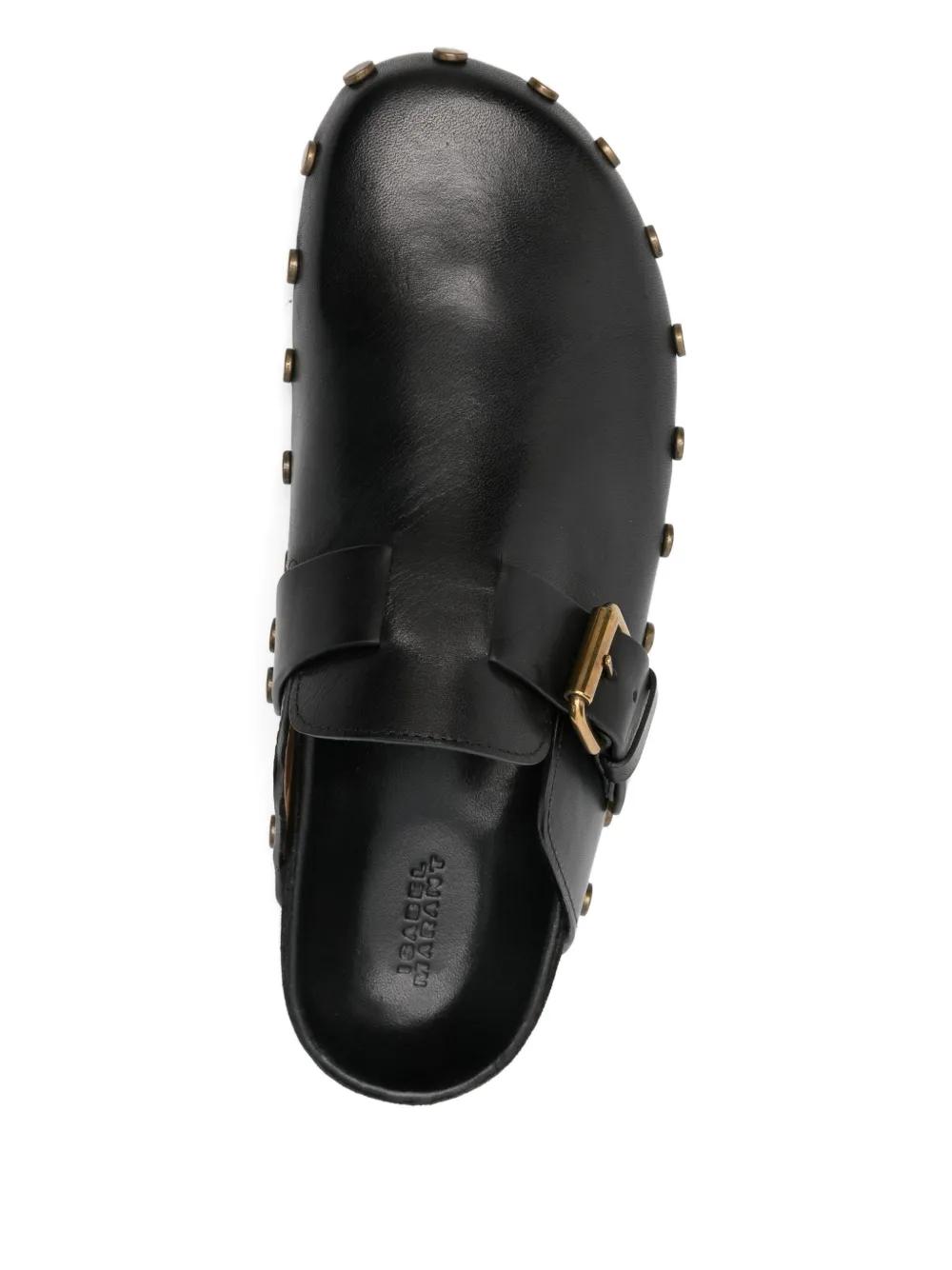 black leather upper buckle fastening studded embellishment flat sole round toe
