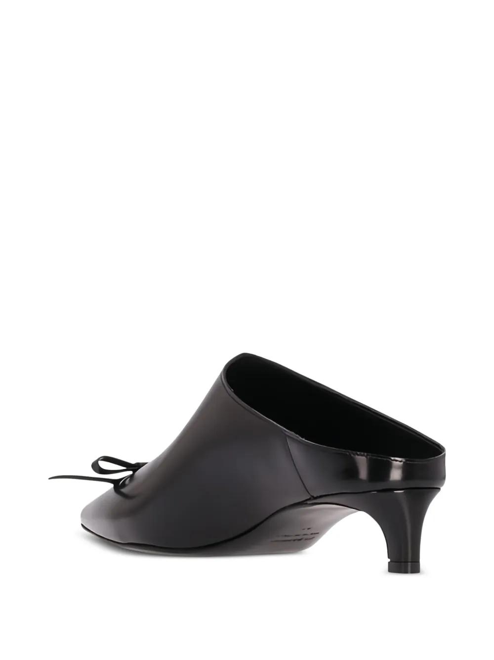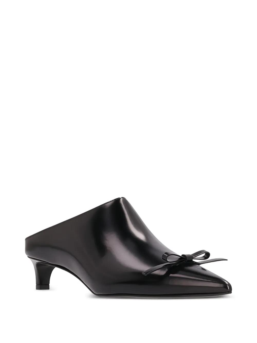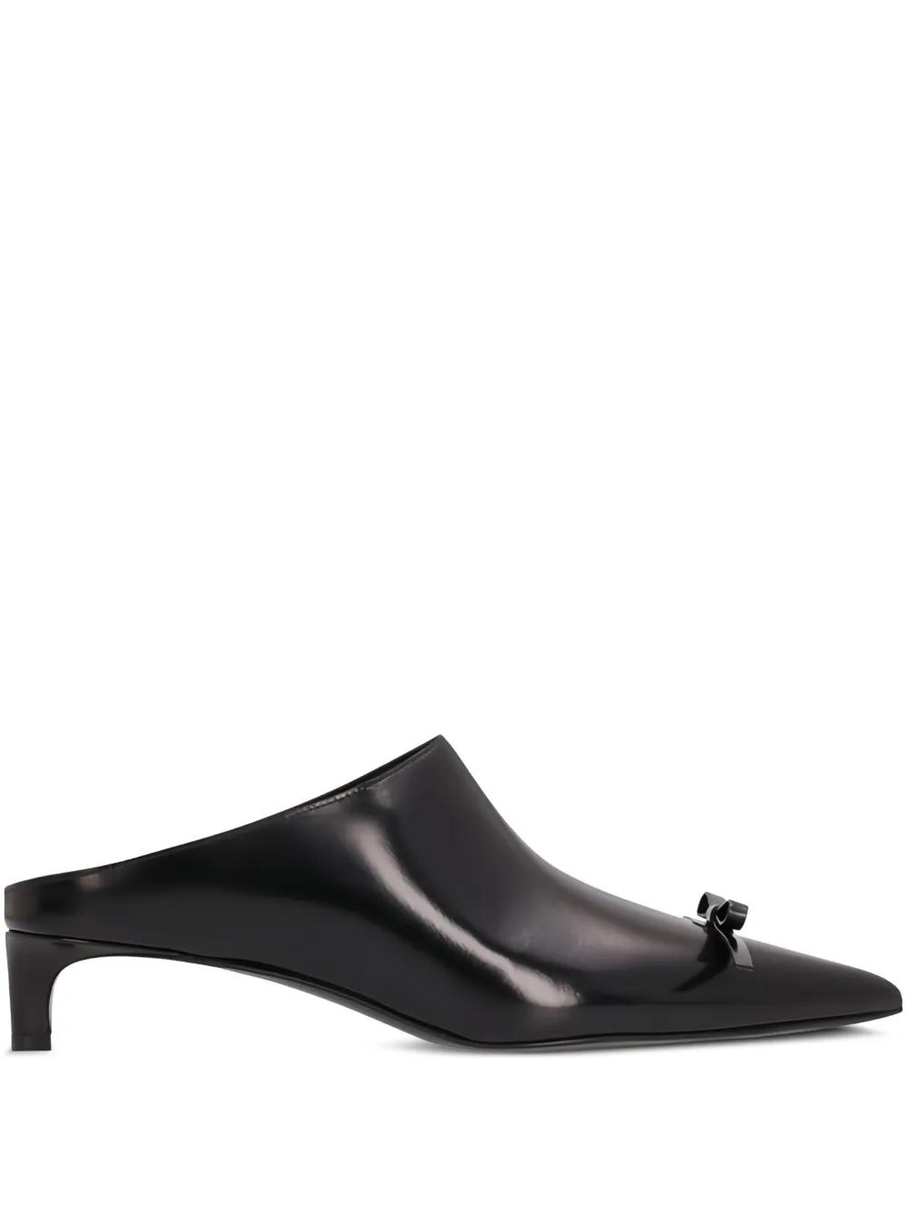 black leather kitten heel pointed toe slip-on style bow embellishment