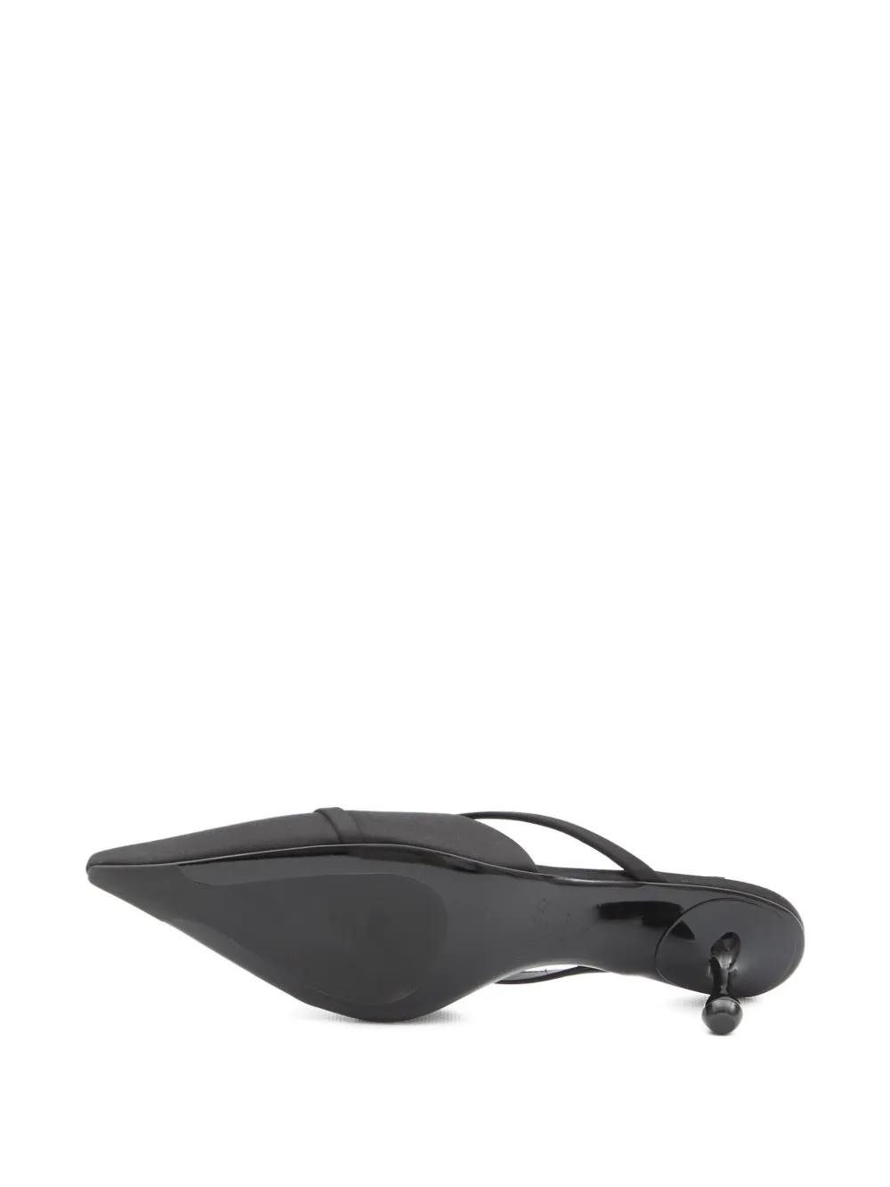 black satin pointed toe strap detailing faux-pearl embellishment embossed logo