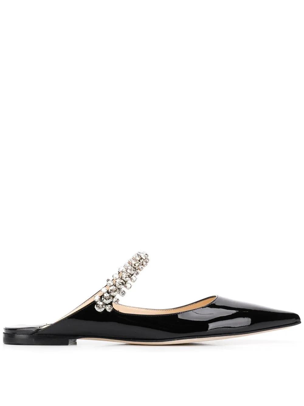 You know when someone's just had a great idea and their internal lightbulb goes "Bing!", well we think that's what happened when Jimmy Choo thought up these black patent leather Bing flat mules. Designed with a pointed toe and a crystal-embellished strap, we'd like to thank whoever had this particular bright idea. Featuring a crystal-embellished strap, a slip-on style, a pointed toe, and a flat leather sole.