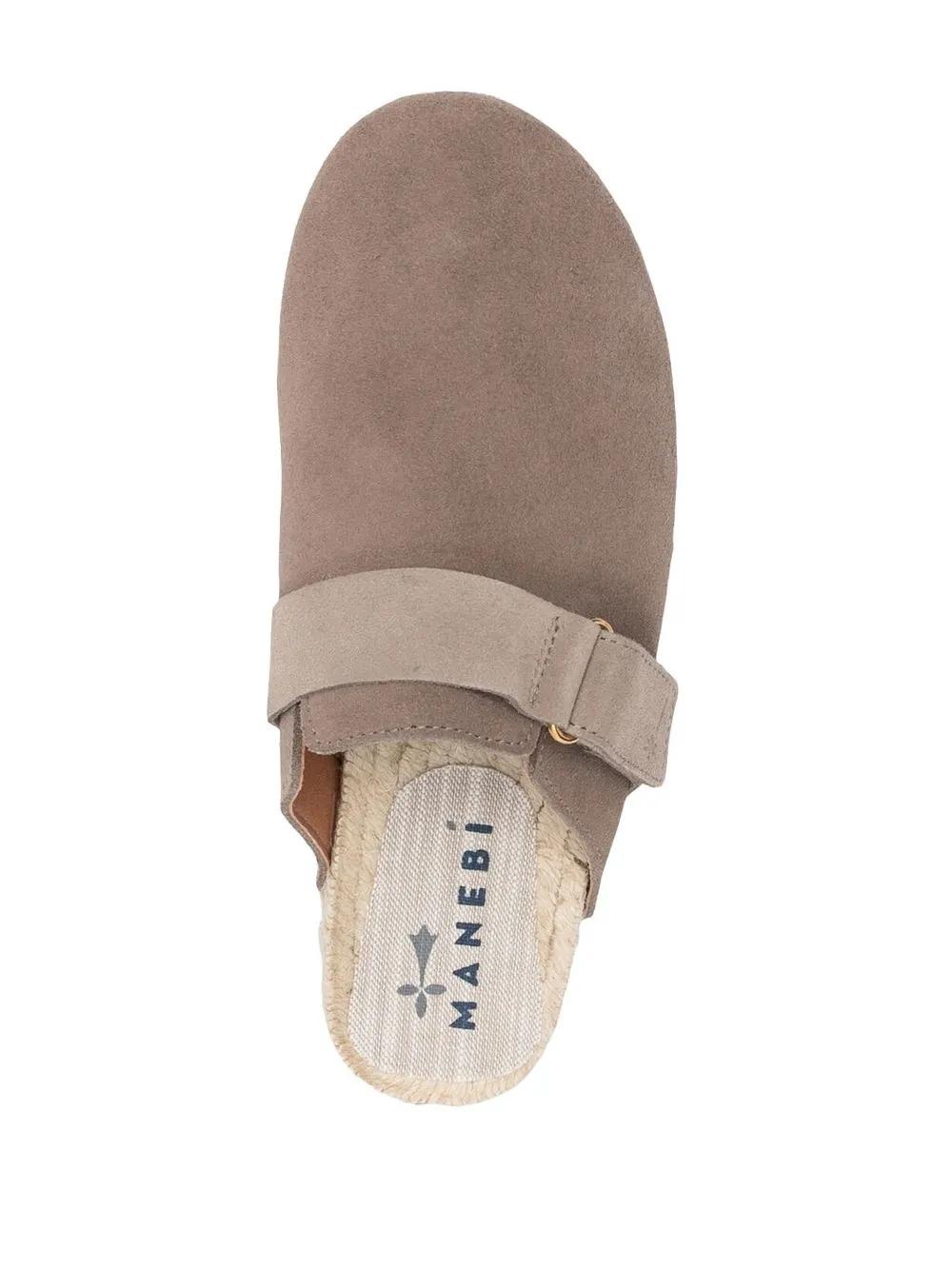 suede round-toe mules from MANEBI featuring round toe, front touch-strap fastening, slip-on style, branded insole, flat rubber sole, coco brown and calf sude blend.