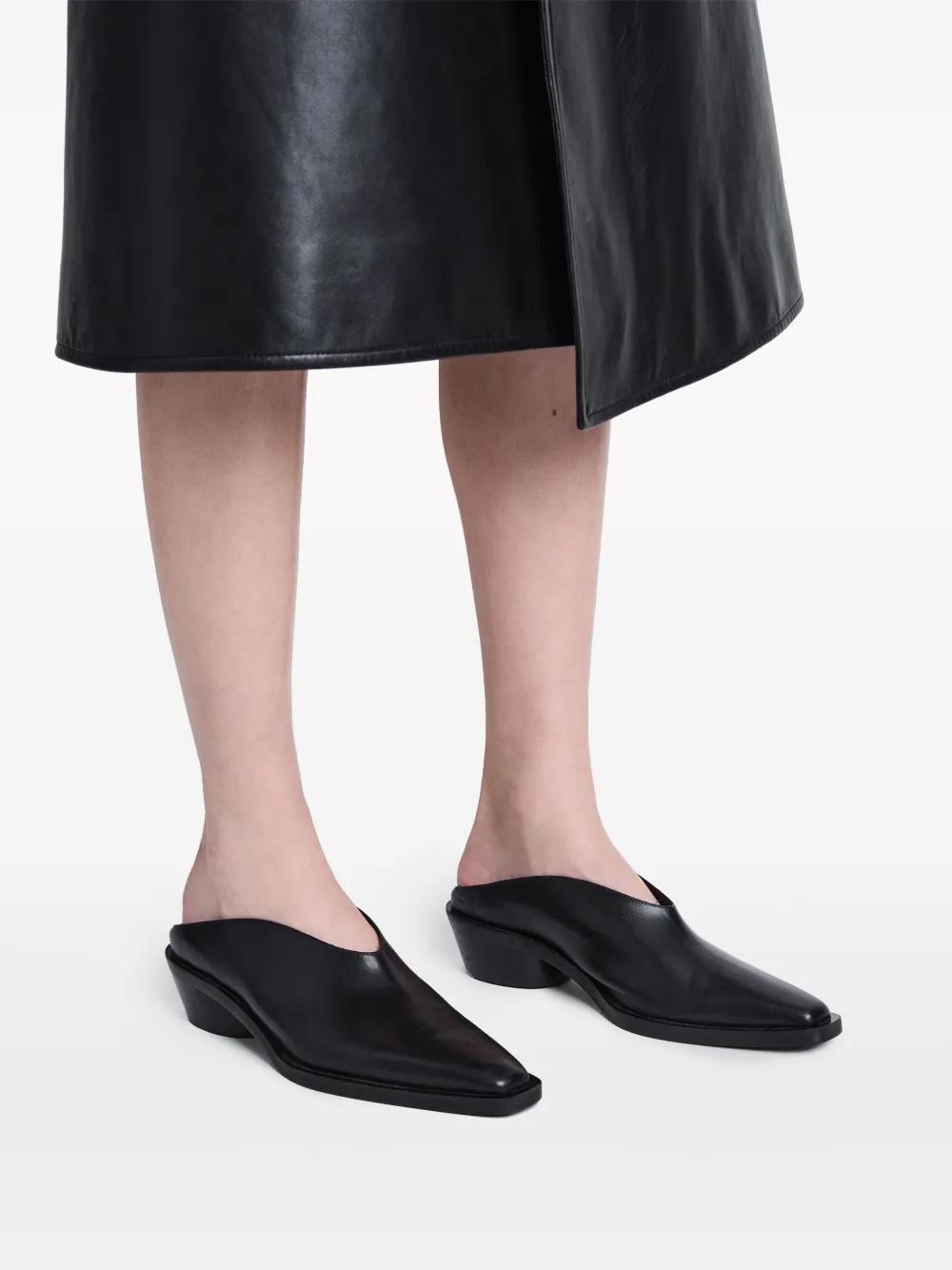 black calf leather smooth grain polished finish square toe slip-on style branded insole low block heel rubber sole