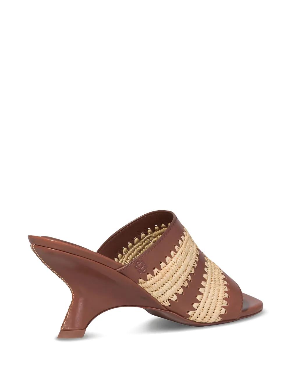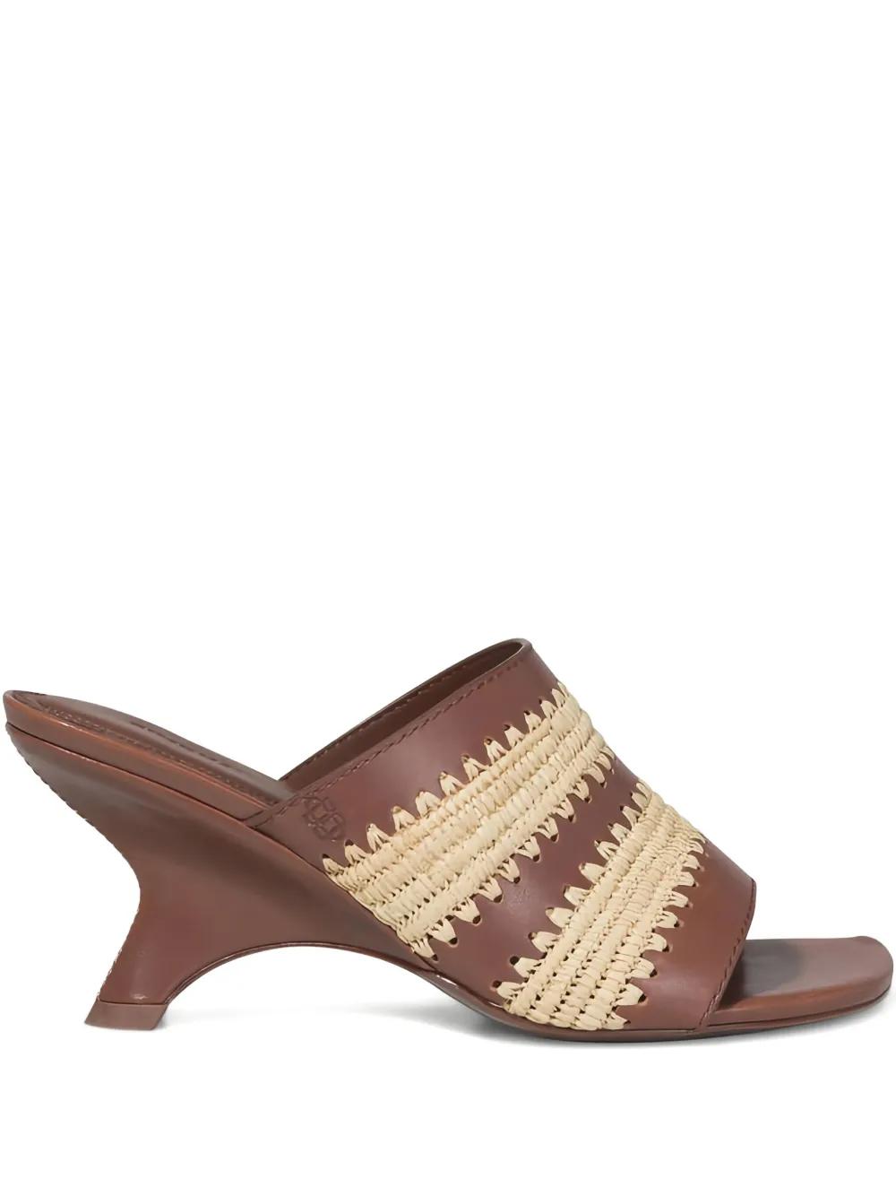brown leather upper raffia detail curved wedge heel open toe slip-on style