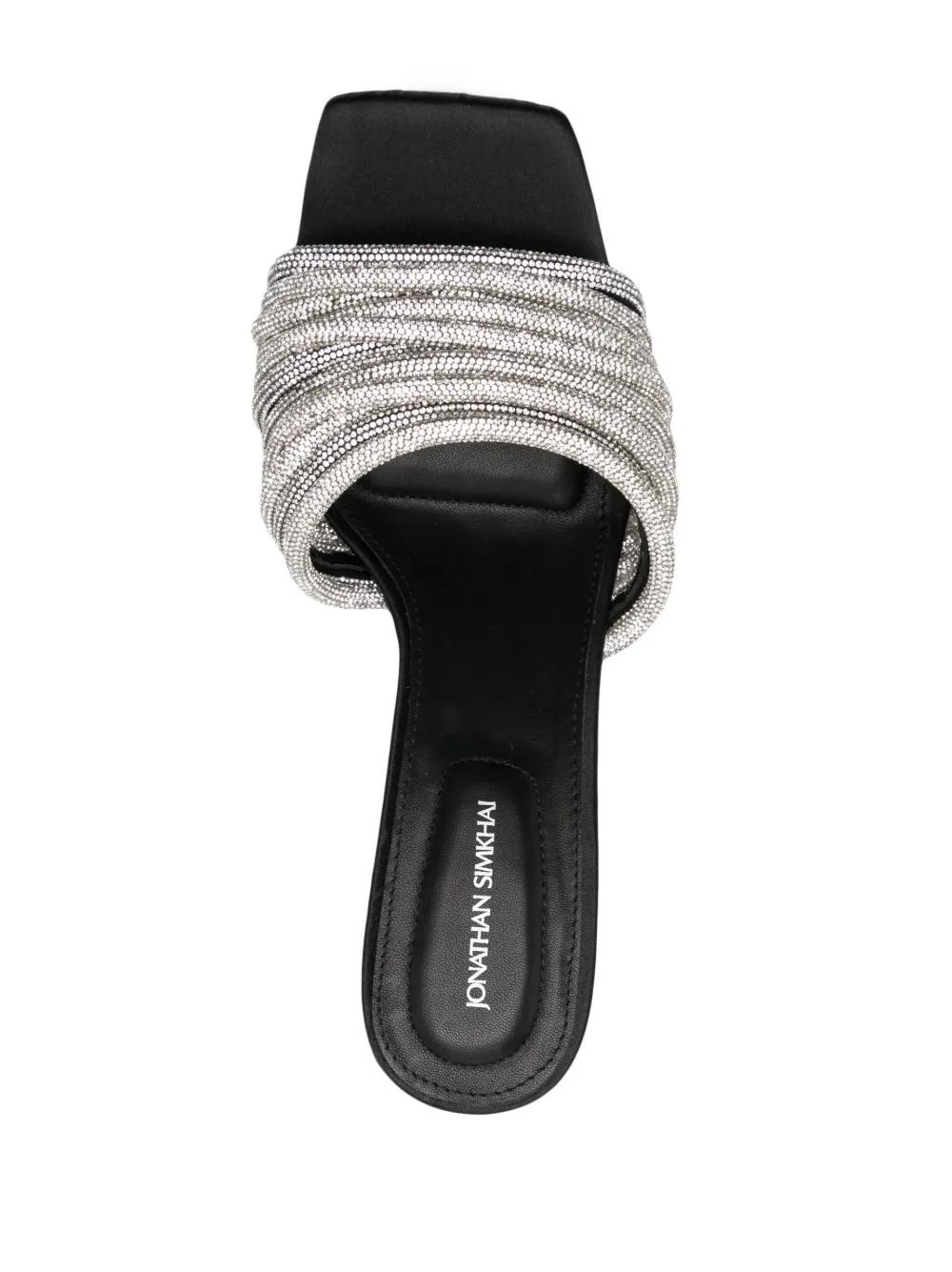black/silver-tone calf leather crystal embellishment branded insole slip-on style square toe open toe 100mm high heel