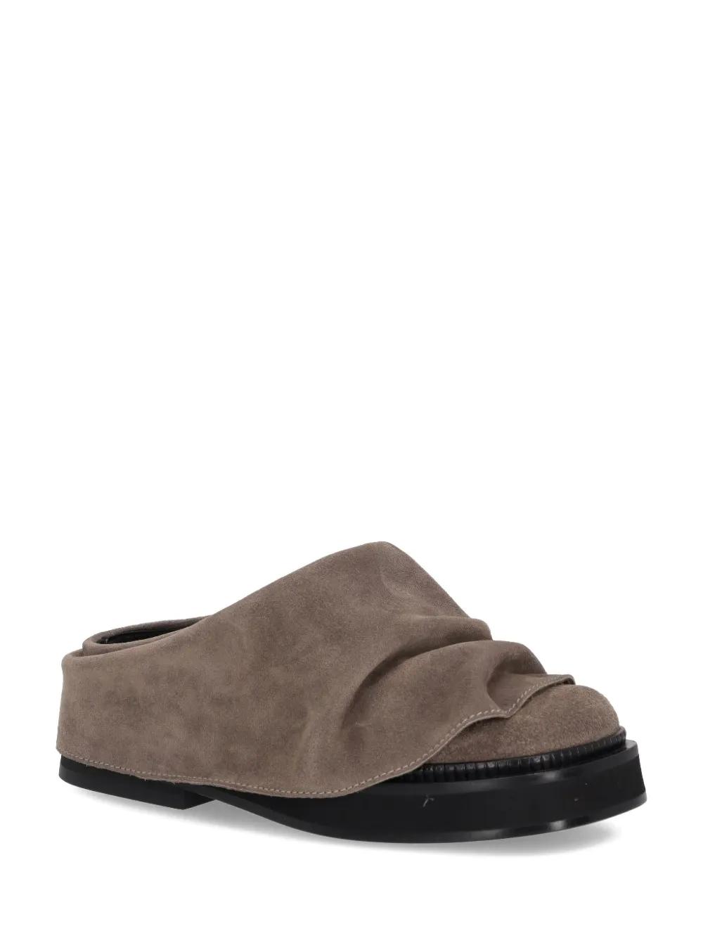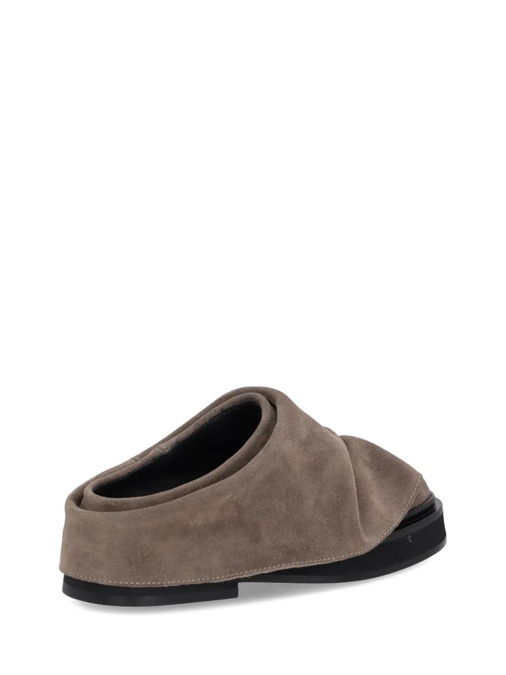 taupe brown suede ruched detailing round toe flat sole slip-on style