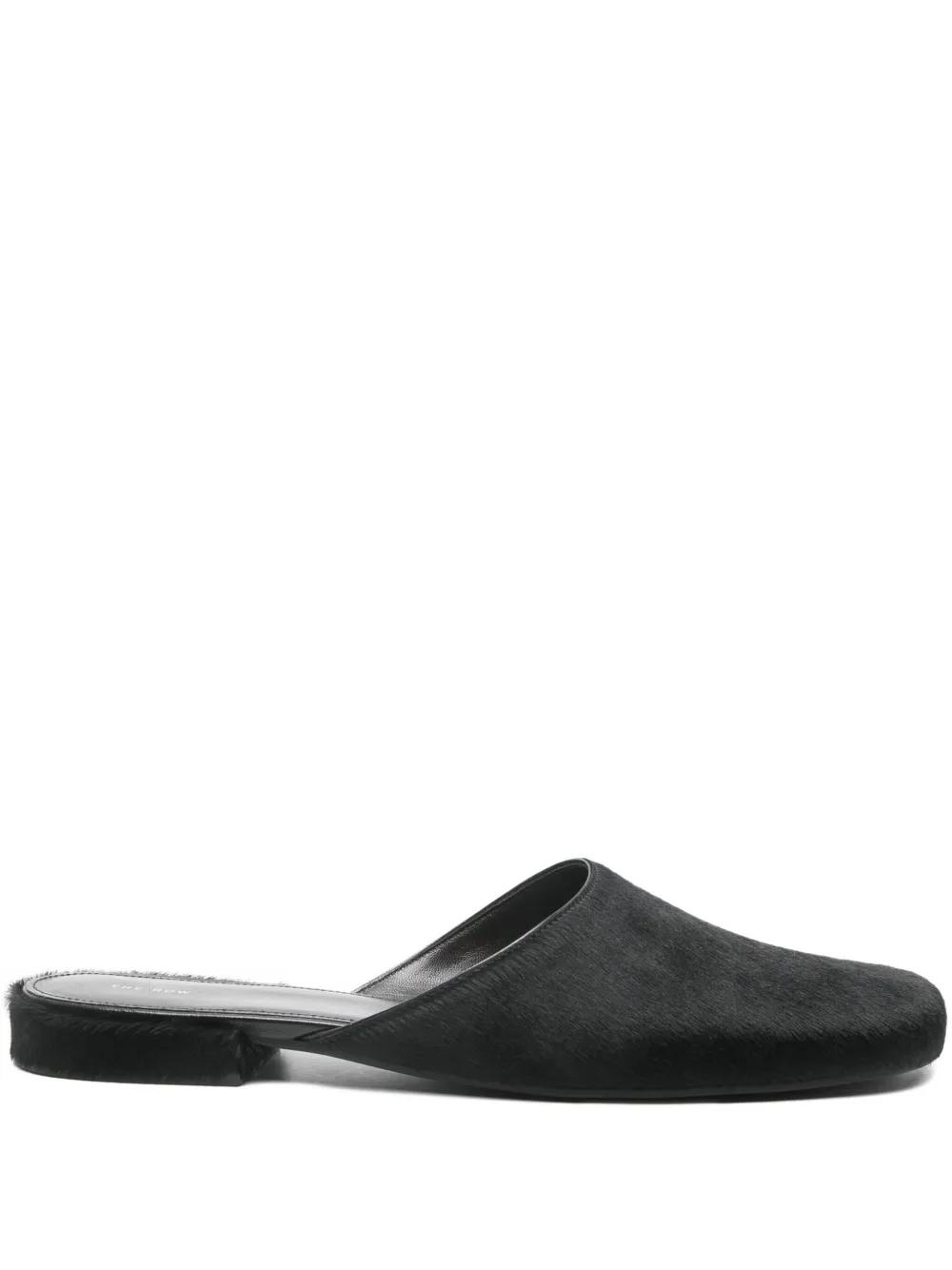 off-white curly fur lace-up detail flat sole rounded toe mottled brown pattern