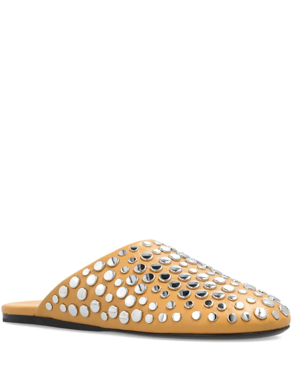 beige leather upper stud embellishment slip-on style round toe flat sole
