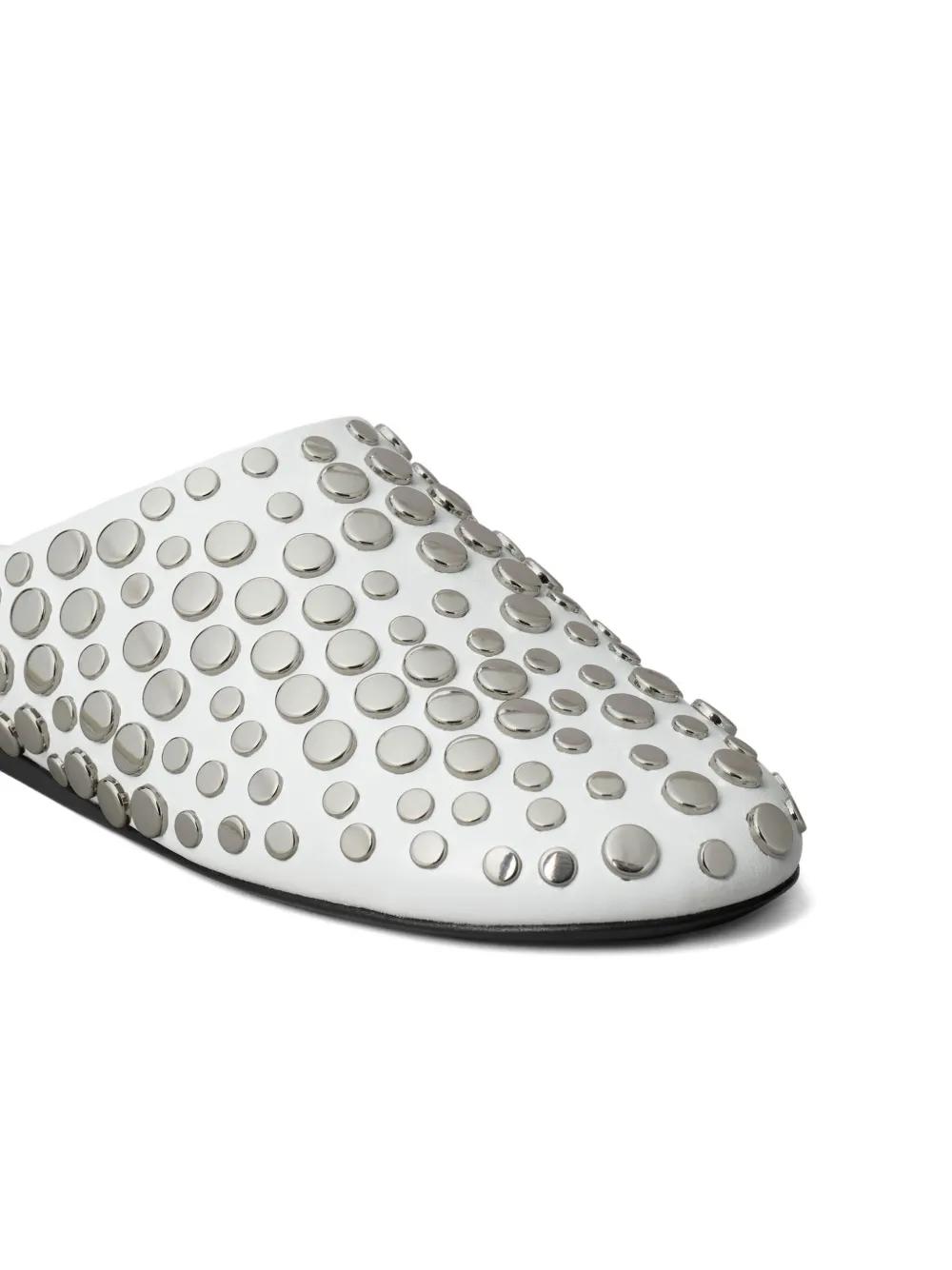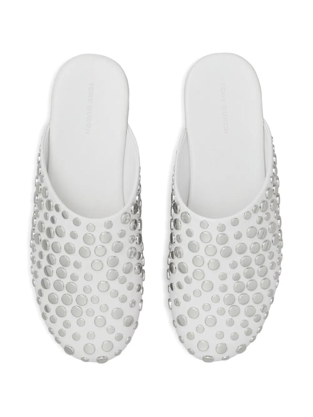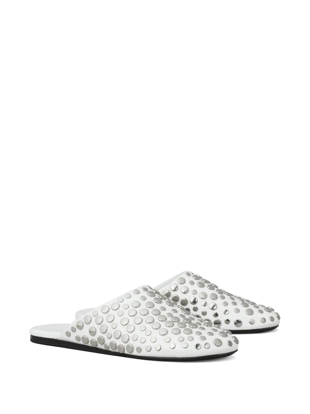 cloud white leather upper metallic stud embellishment flat sole open toe slip-on style