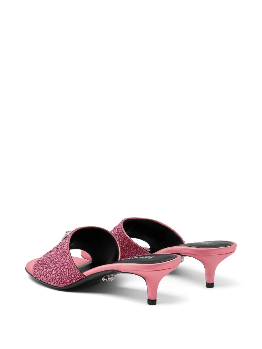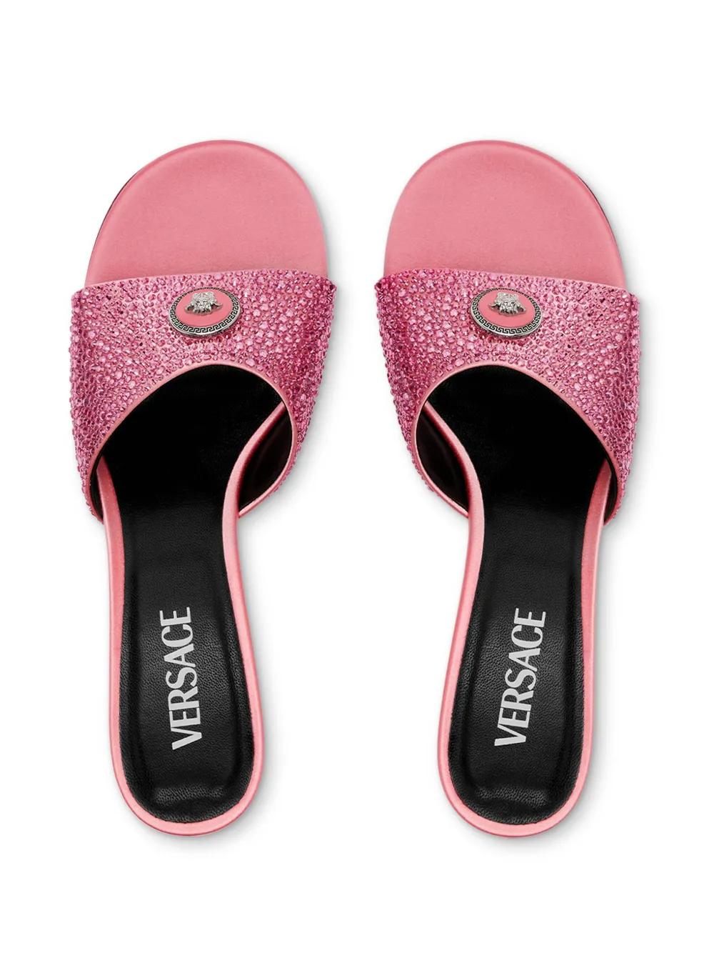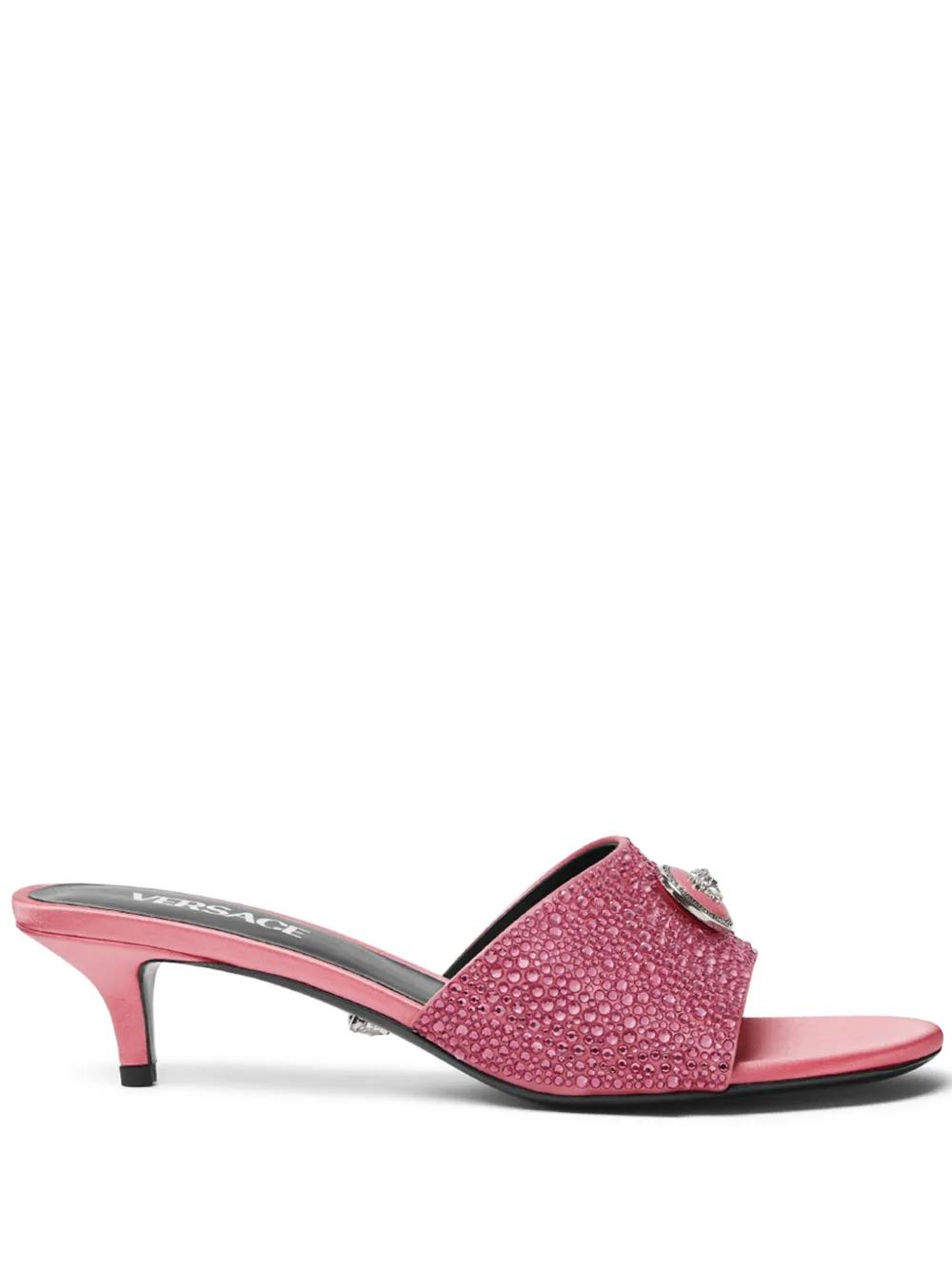 pink calf leather Medusa Head motif rhinestone embellishment round open toe kitten heel branded leather insole slip-on style
