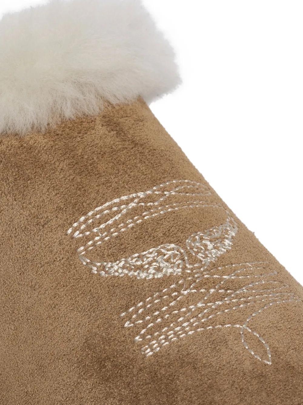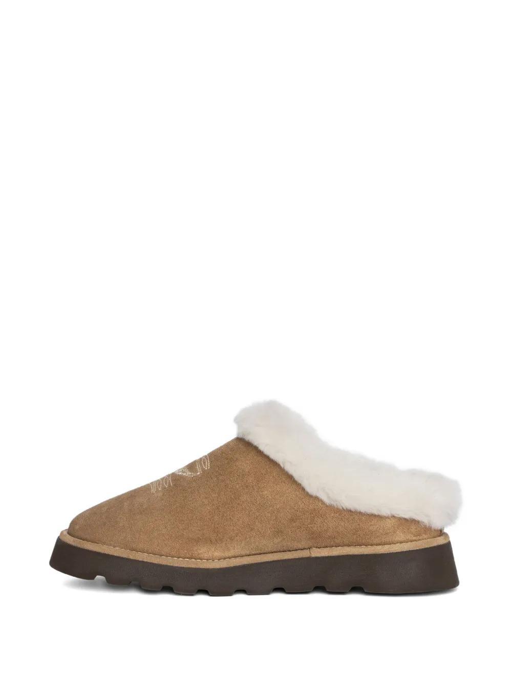 brown suede upper embroidered detail shearling trim rubber sole slip-on style