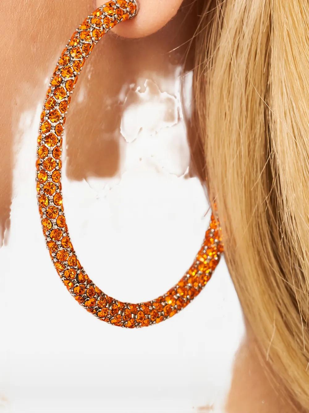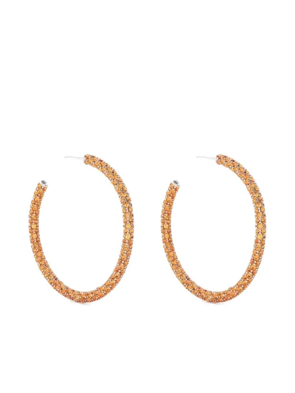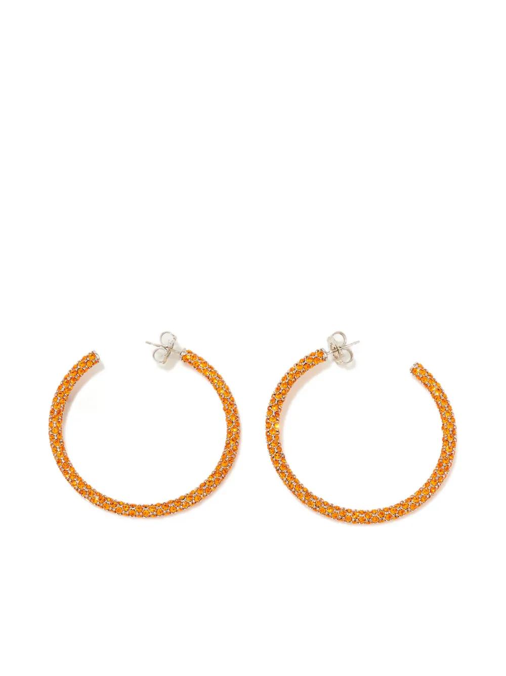 silver-tone and orange crystal embellishment stud fastening hoop shape These earrings come as a pair. Normal everyday use and external agents may reduce the lustre of gemstones and gold surfaces. To maintain, use specific, non-abrasive products specially meant for cleaning jewellery.