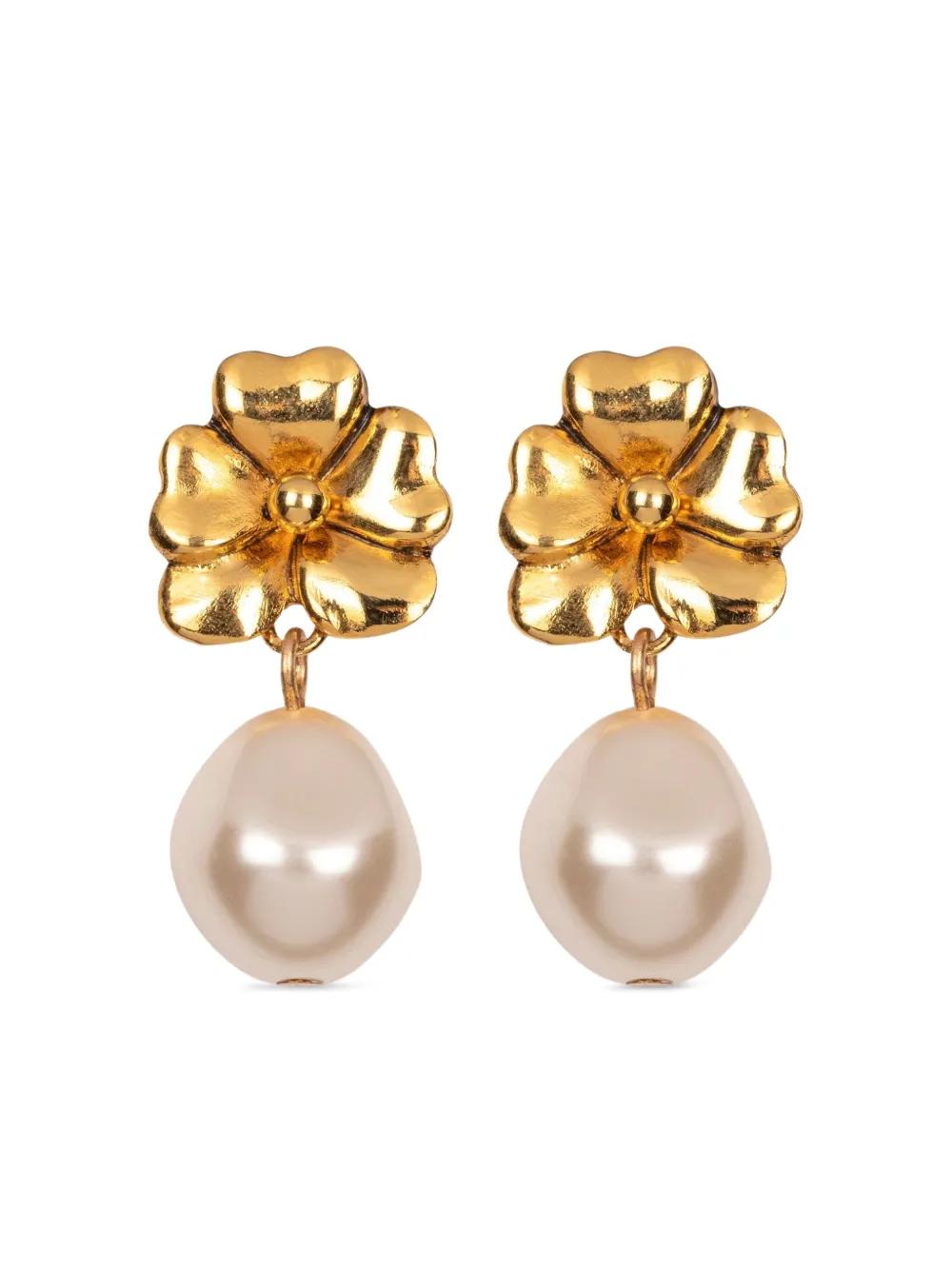 18kt gold plated polished finish hammered-effect finish floral motif drop design faux-pearl detailing post-back fastening for pierced ears These earrings come as a pair.