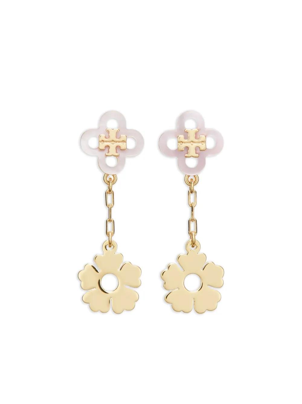 gold pink shell clover motif gold chain gold flower detail cut-out flower design drop design These earrings come as a pair.
