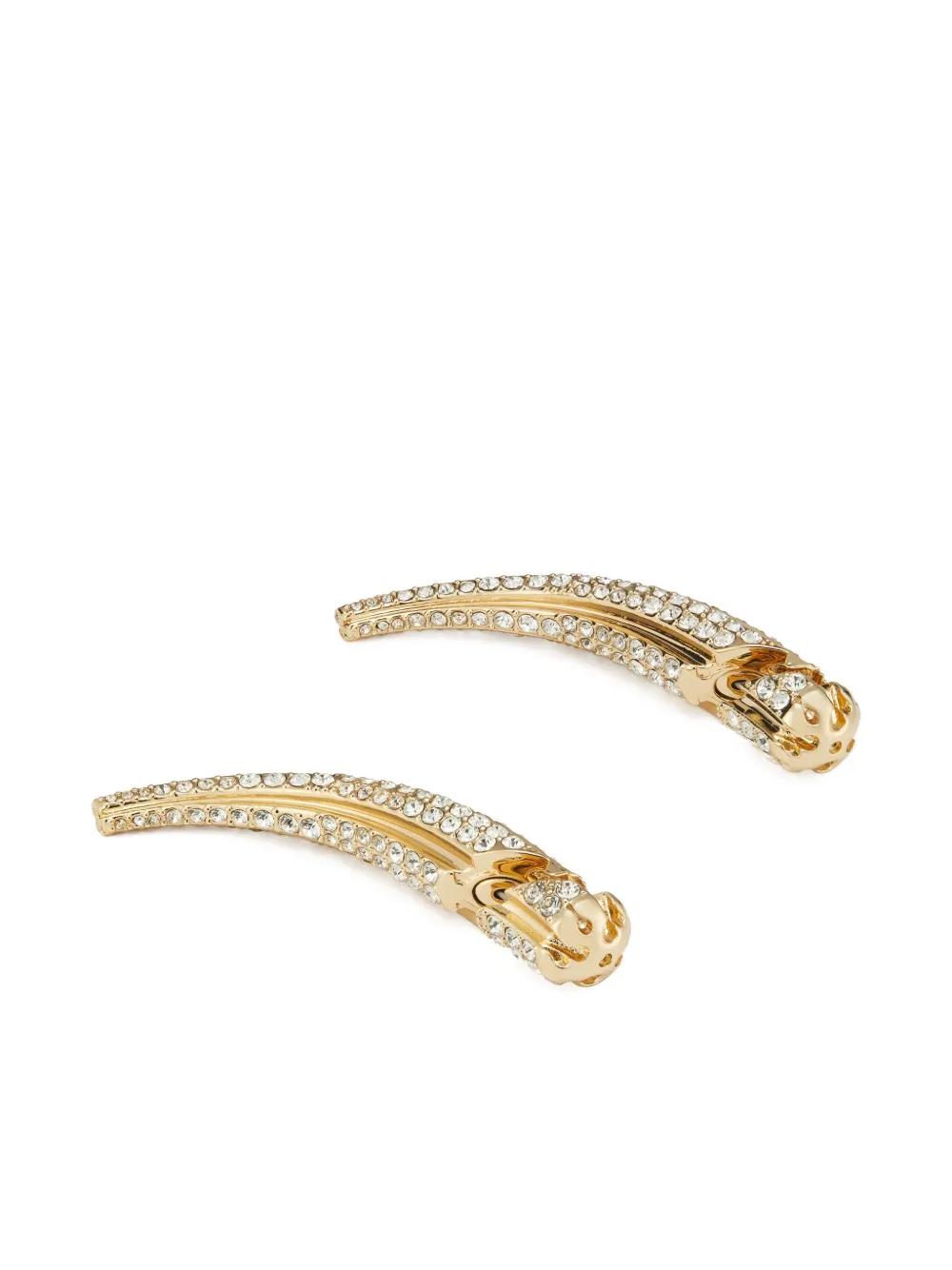 light brass curved spike design pavé-set crystals post fastening front-back design logo detail