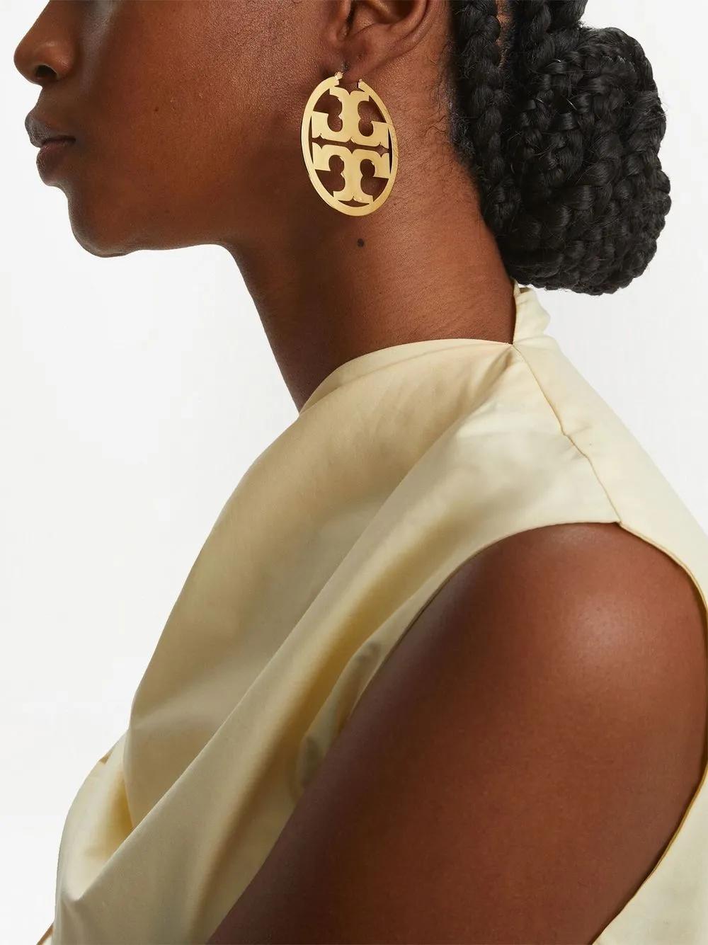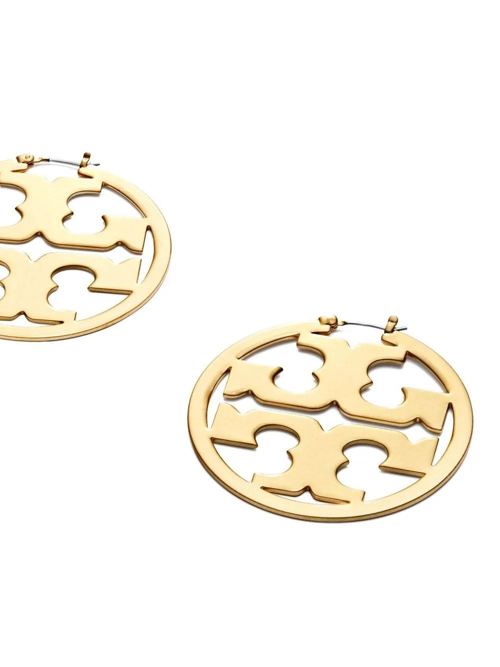 gold 18kt gold plated polished finish logo plaque large hoop design Sold in pairs.