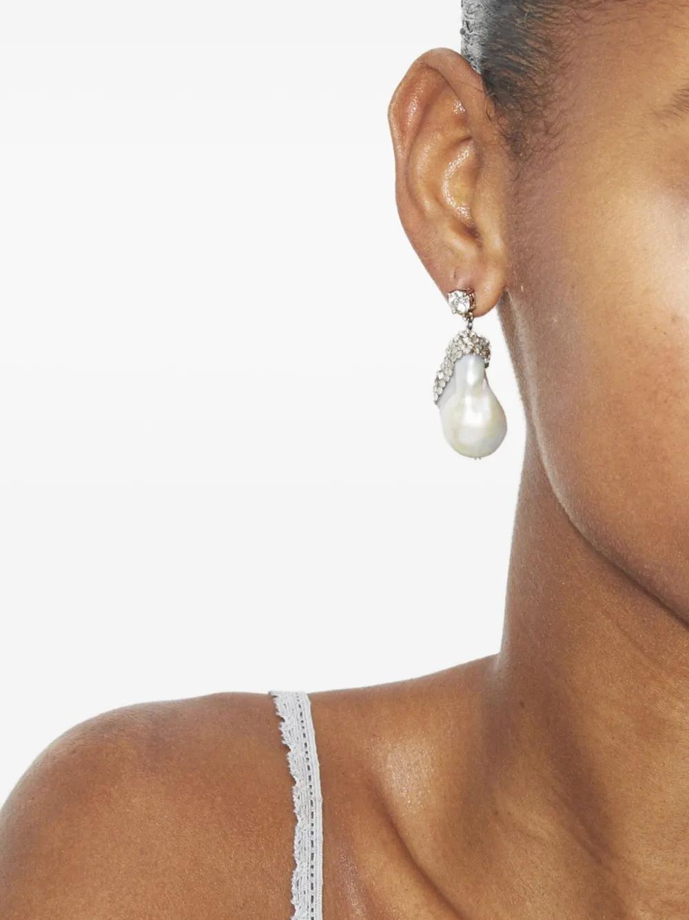 silver-tone crystal embellishments pearl detail drop style post-back fastening Pearls should be the last thing that you put on in the morning and the first thing you take off at night. Avoid contact with perfumes or creams, and simply wipe with a soft cloth to clean.