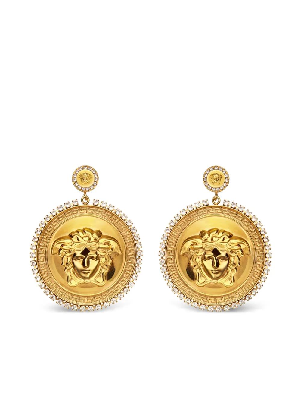 gold-tone medusa head crystal embellishment circular frame post back fastening These earrings come as a pair.