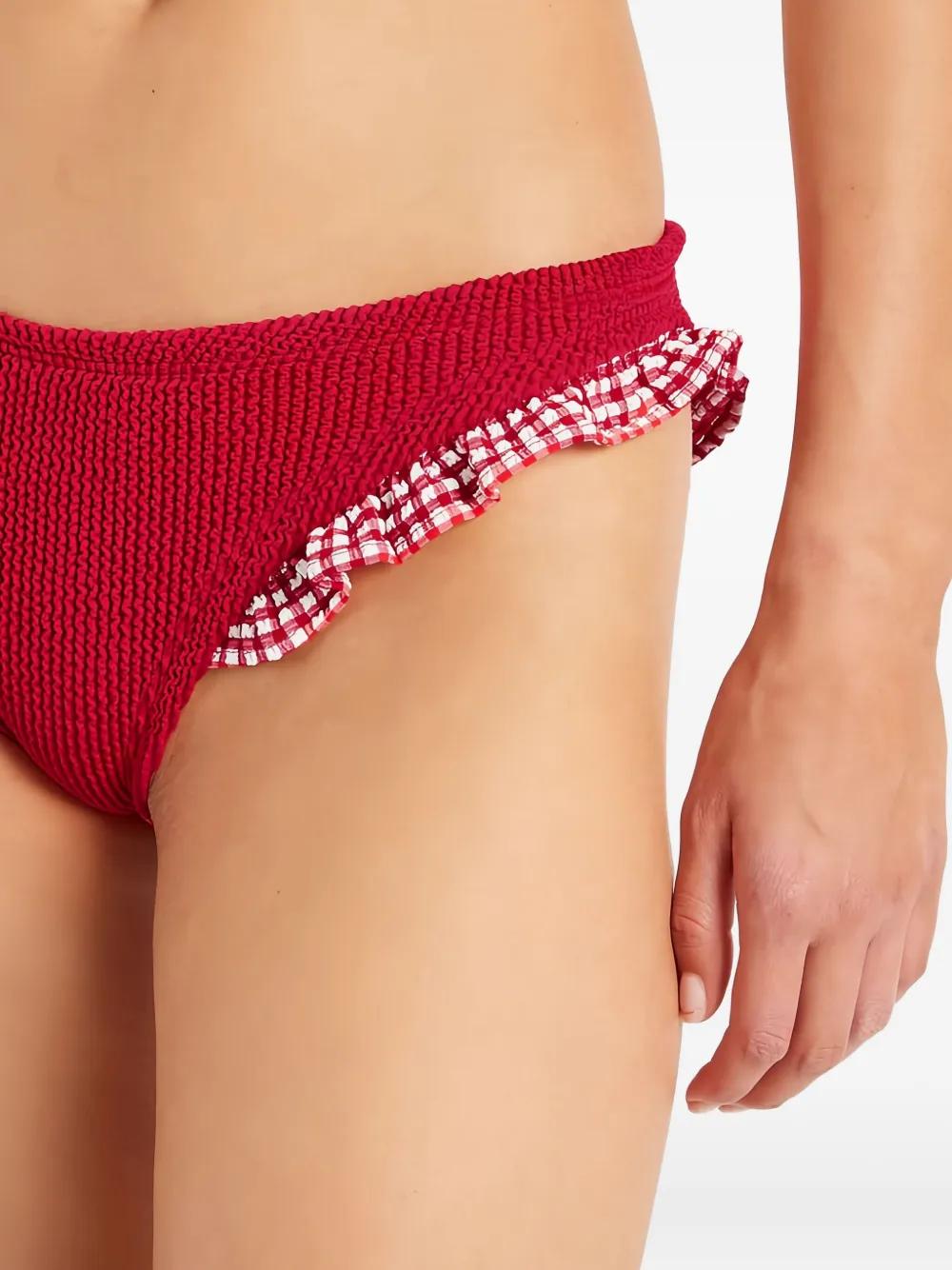red check detail ruffled trim textured fabric Be mindful to try on swimwear over your own garments.