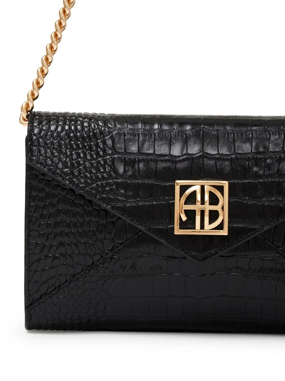 black calf leather embossed crocodile effect foldover top with magnetic fastening monogram plaque gold-tone hardware single shoulder strap main compartment internal slip pocket
