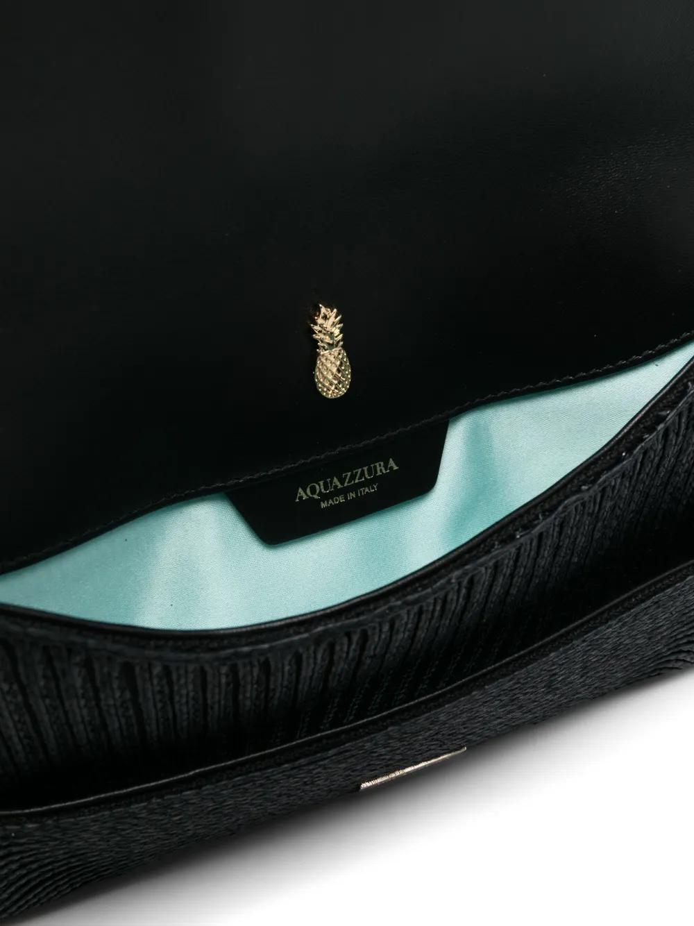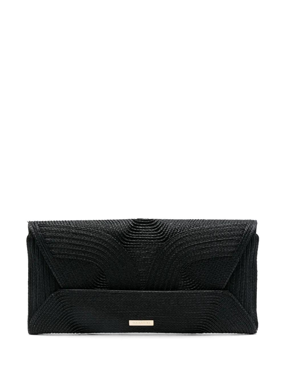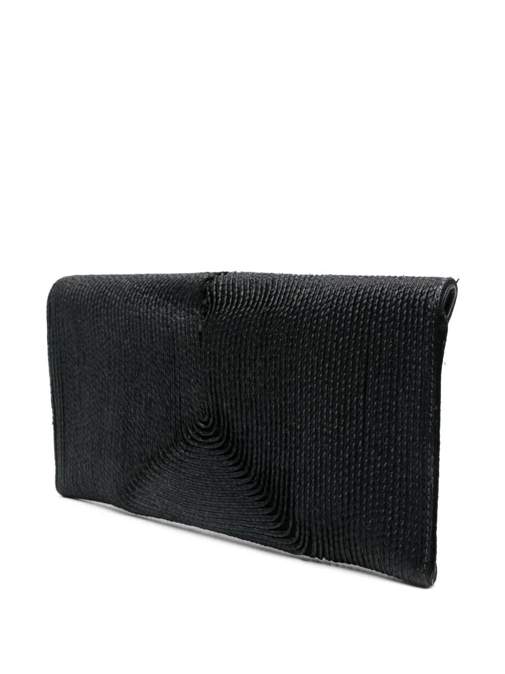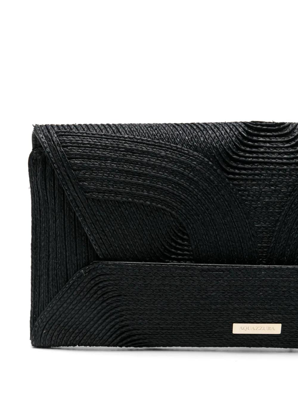 black woven raffia design sliding foldover top logo plaque main compartment contrast lining This piece comes complete with a protective dust bag.