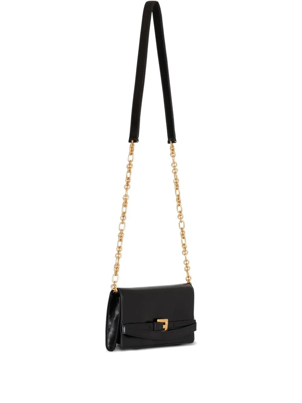 black calfskin gold-tone hardware chain strap buckle detail press-stud fastening