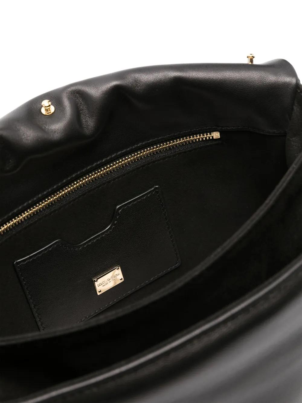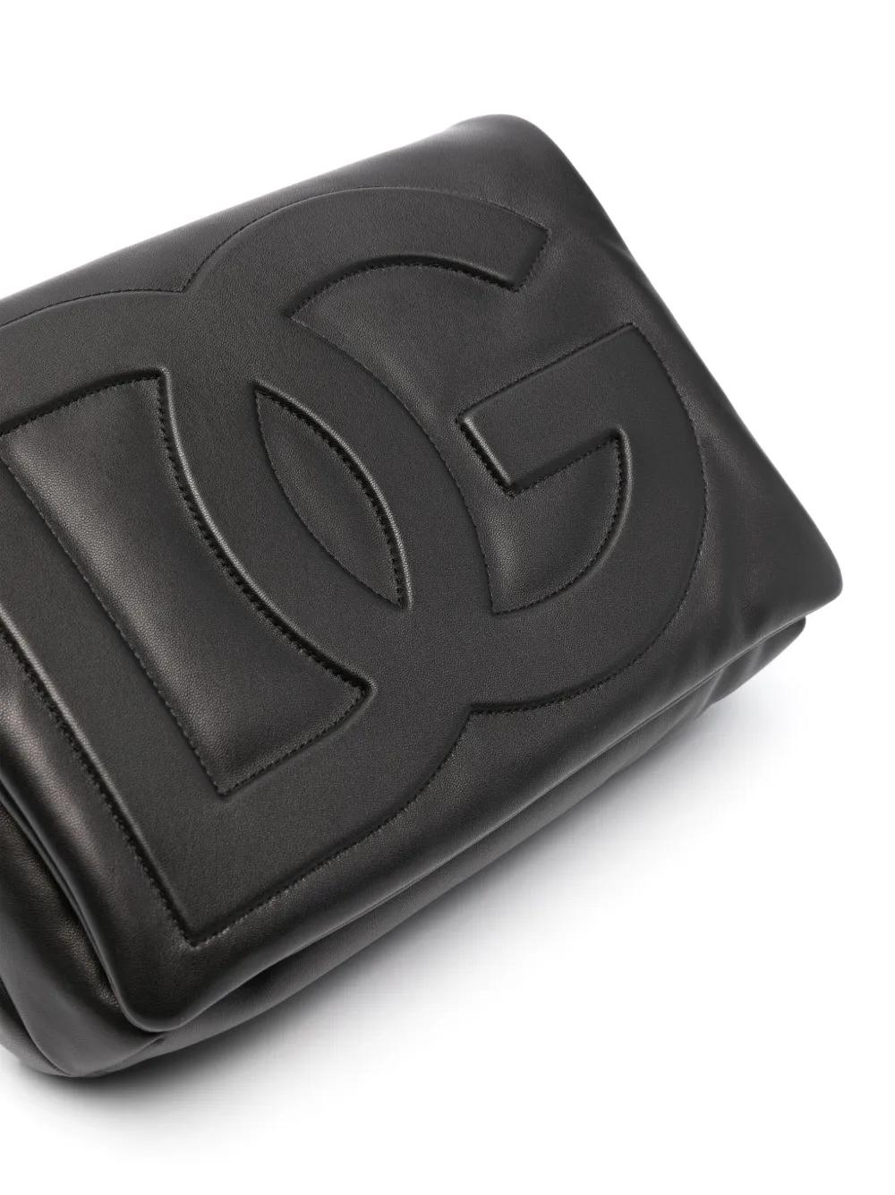 black leather rectangle shape embossed logo to the front adjustable detachable shoulder strap foldover top main compartment internal zip-fastening pocket internal card slot