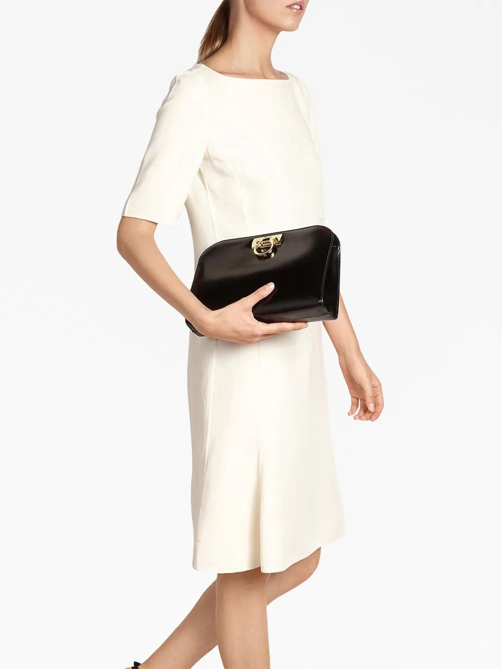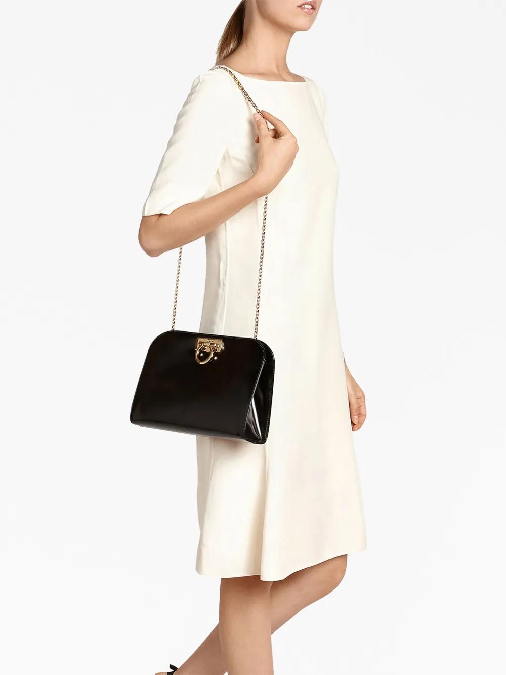 black calf leather Gancini buckle gold-tone hardware internal logo patch internal zip-fastening pocket detachable chain-link shoulder strap main compartment