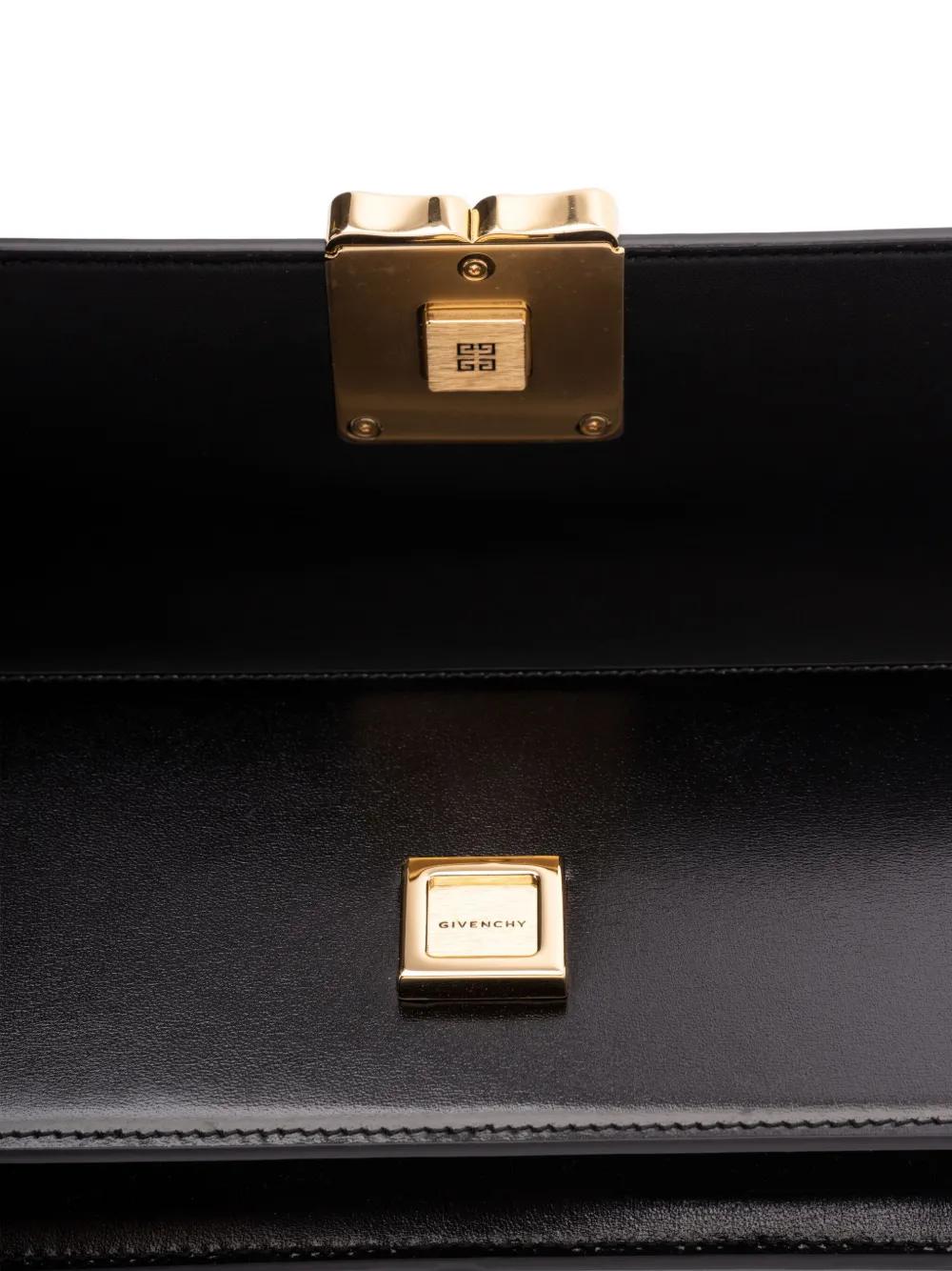 black gold-tone hardware front logo plaque foldover top with push-lock fastening detachable shoulder strap chain-link detail clamshell design