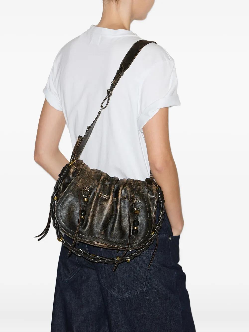 black leather drawstring closure beaded embellishment adjustable shoulder strap gathered detailing