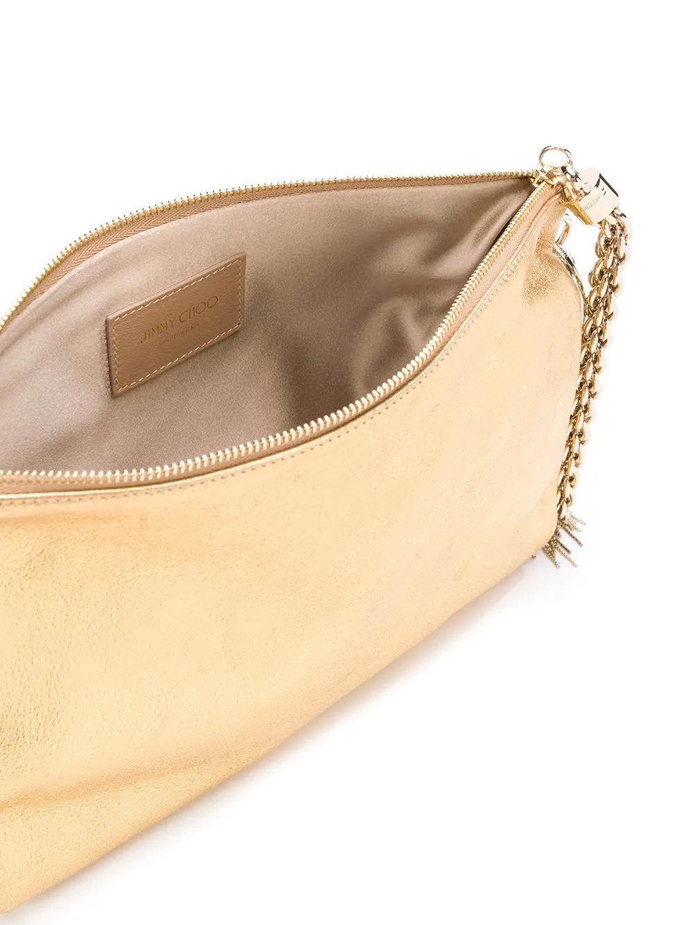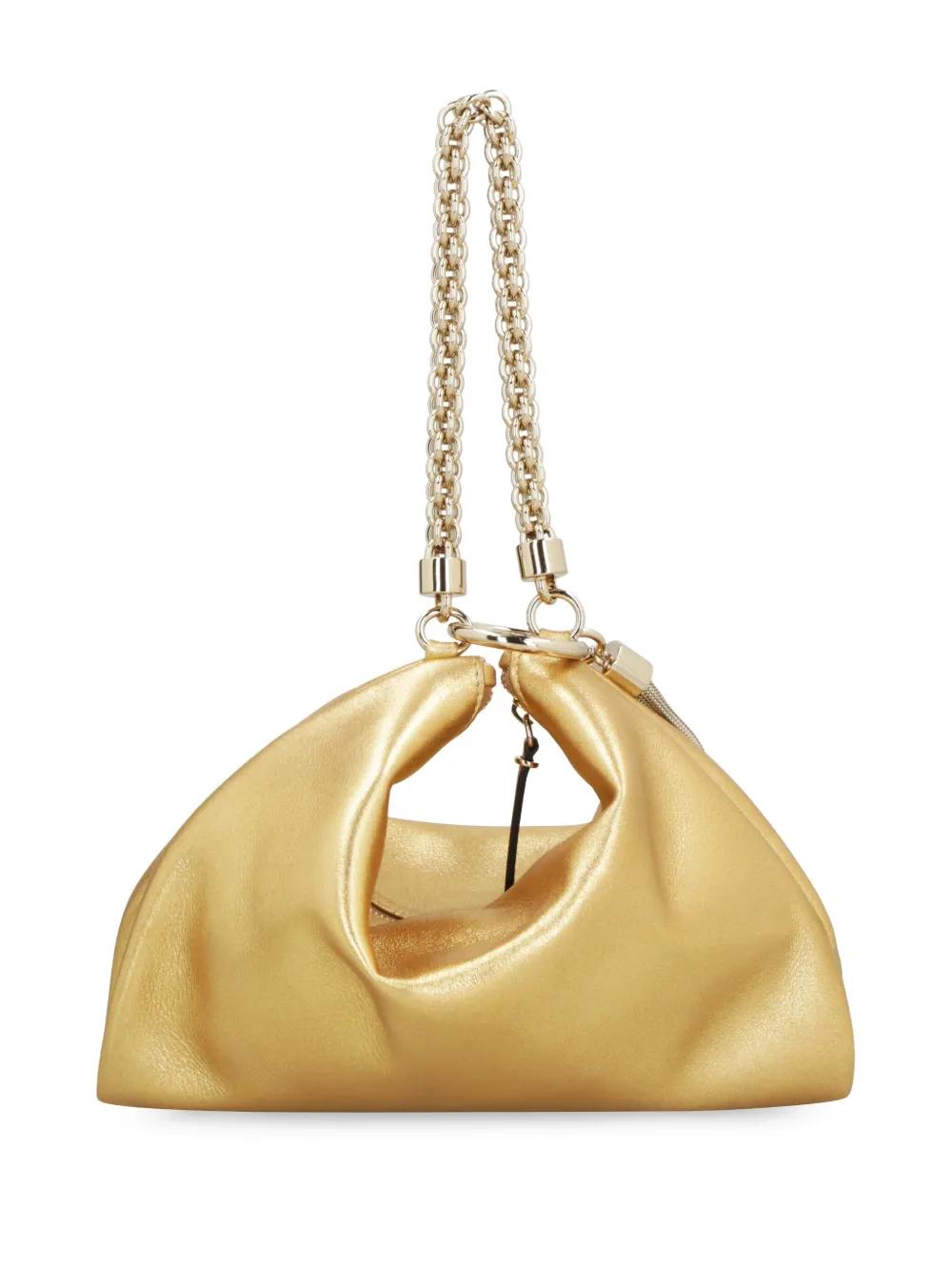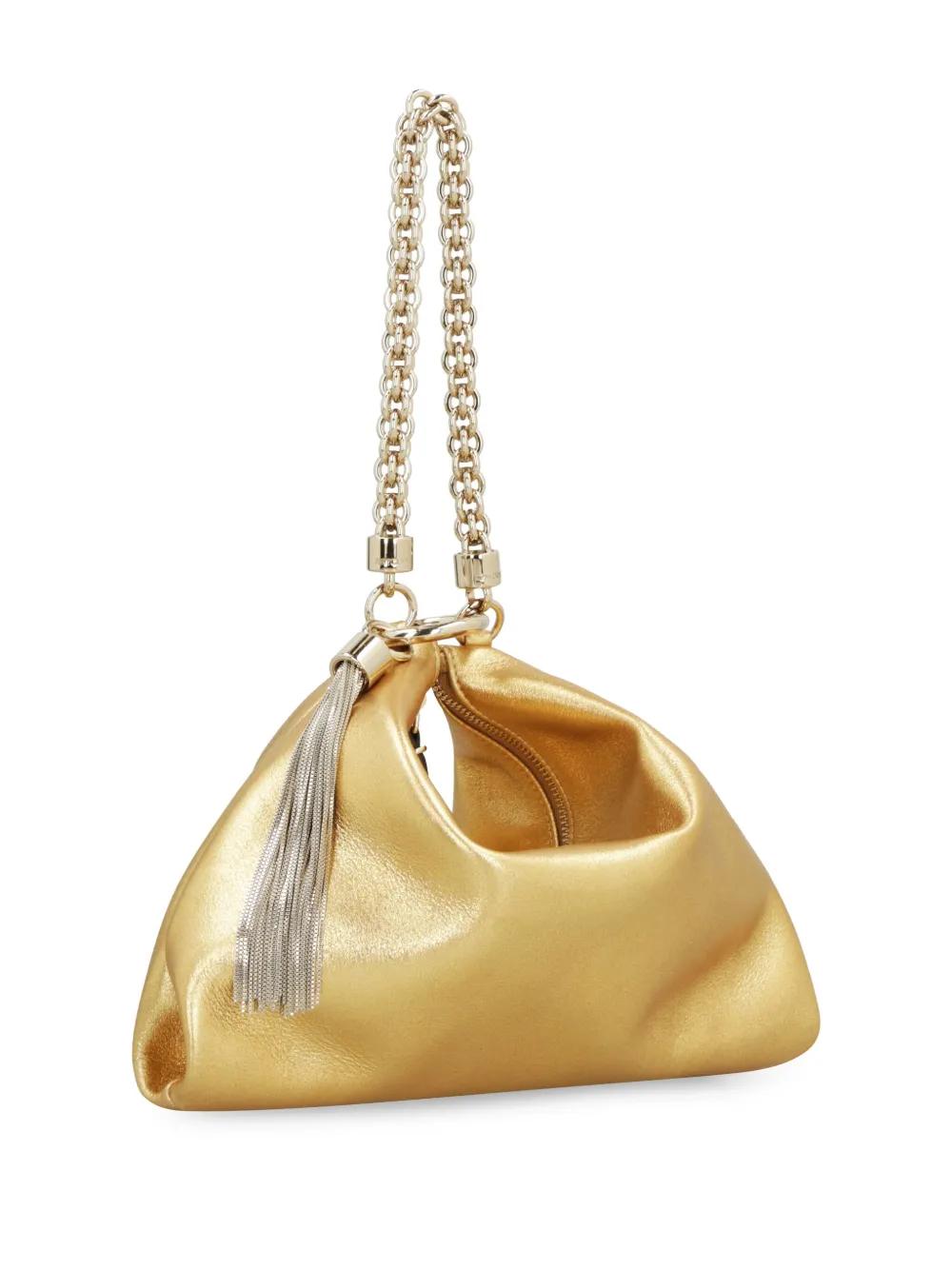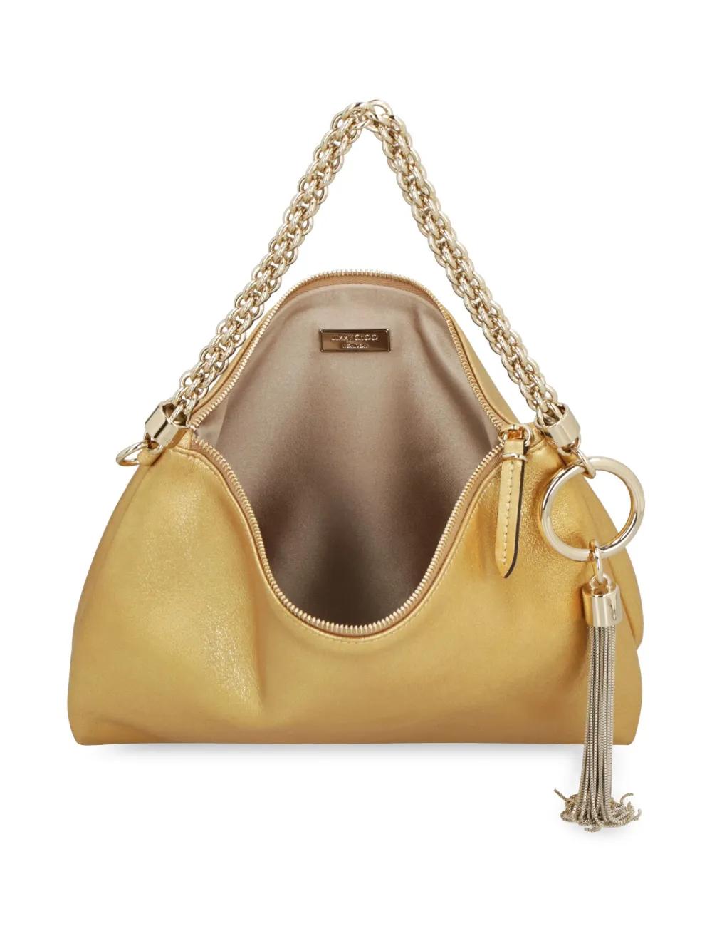 gold-tone leather metallic finish top zip fastening detachable chain-link top handle tassel detail slouch body main compartment internal logo plaque contrast lining