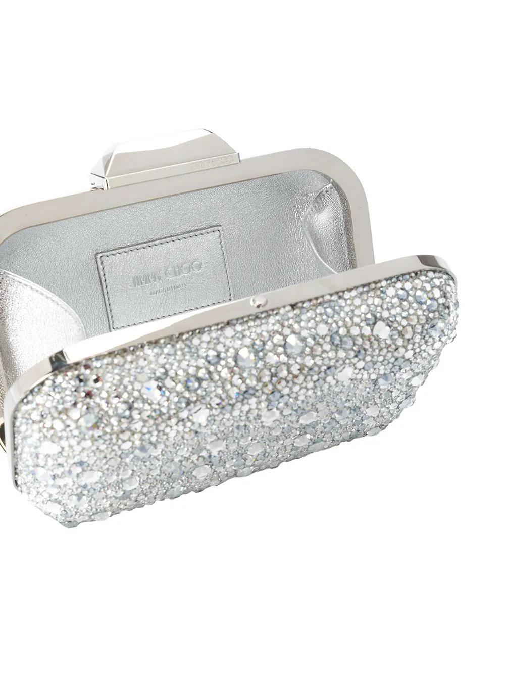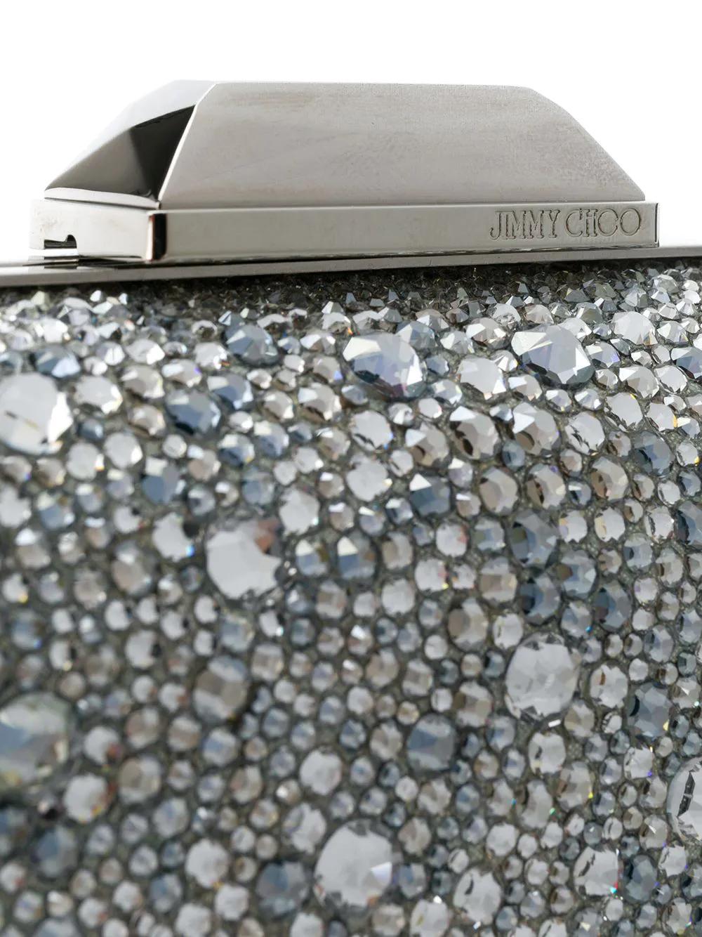 Pick Jimmy Choo's Cloud clutch for your next party accessory. A luxuriously elegant piece with a dramatic flair, this clutch bag, adorned with an all over Swarovski crystal embellished body, is topped off with a signature cube push lock closure. Lined with soft lamb skin leather, the clutch features an internal logo patch.